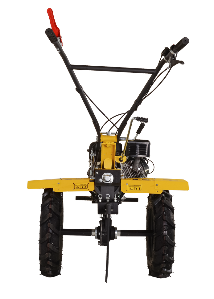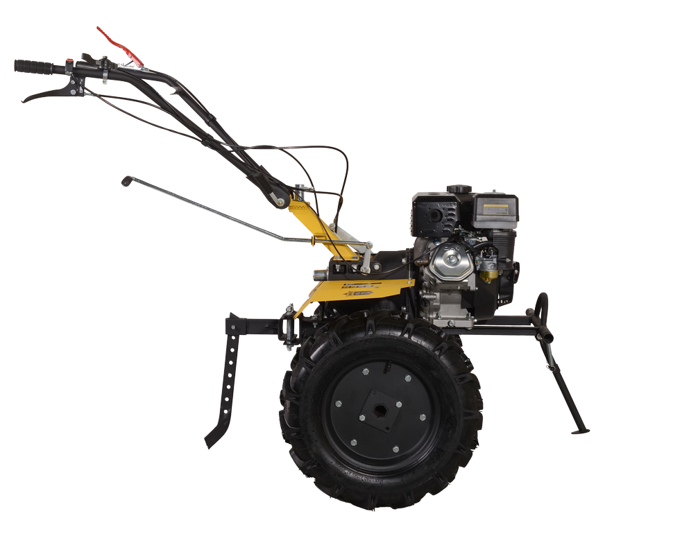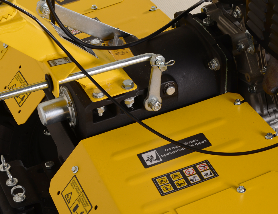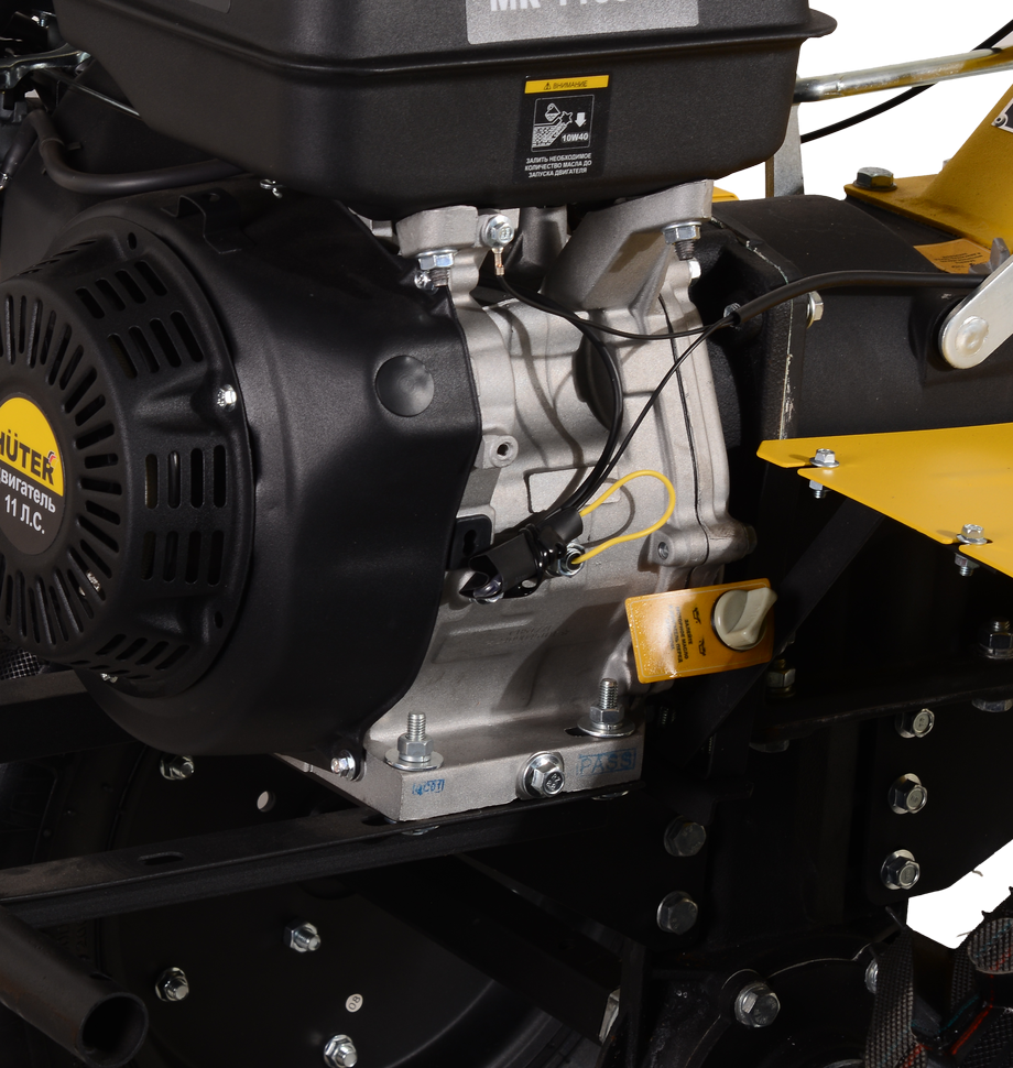 Мощный 4Т одноцилиндровый двигатель с автоматической регулировкой частоты вращения легко запускается вручную. Расход топлива составляет 375 г/кВт в час, емкости бензобака 6 л хватает на длительное время работы без дозаправки. Шестеренчатый редуктор в масляной ванне из чугуна и усиленная хромированная поршневая группа гарантируют надежность конструкции. Сельскохозяйственная машина комплектуется фрезами диаметром 32 см, которые способны обеспечить ширину обработки до 115 см.