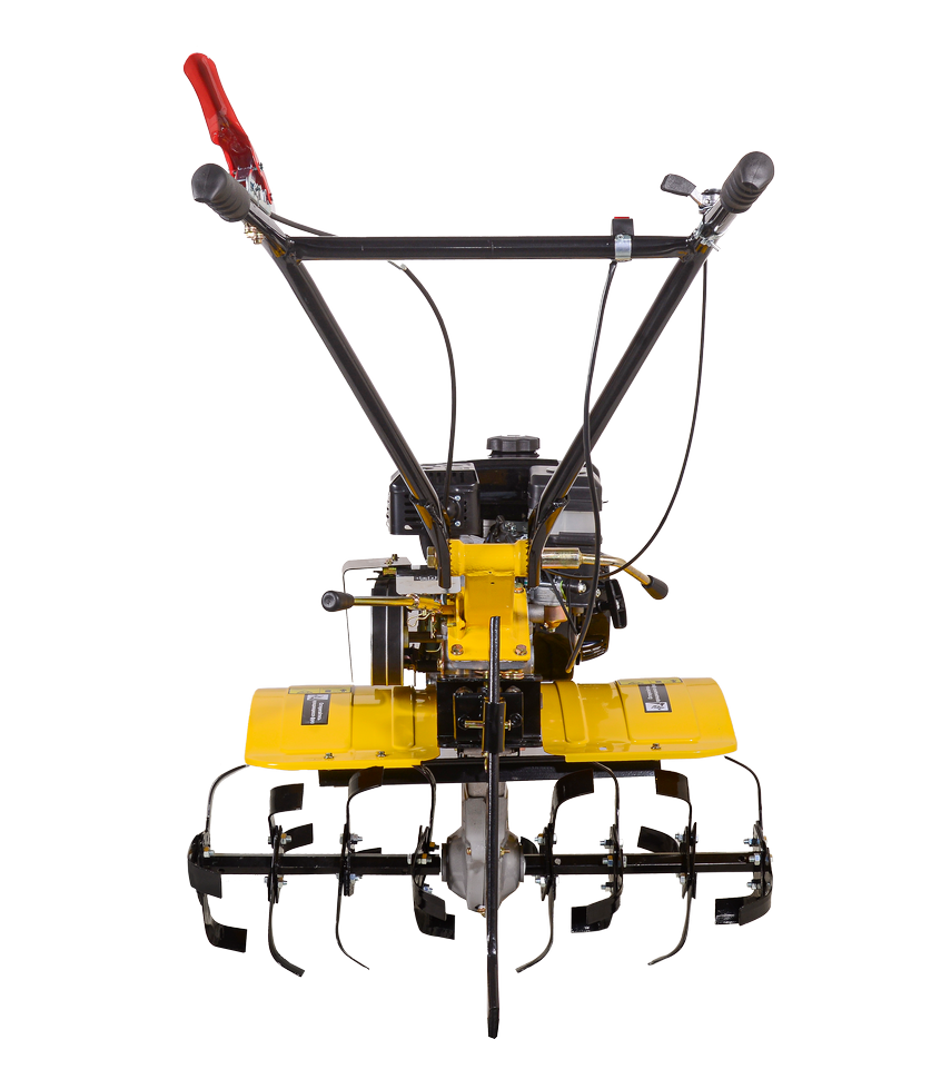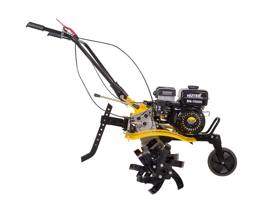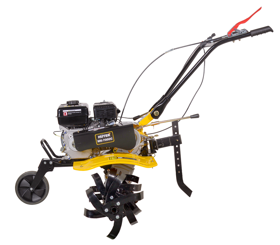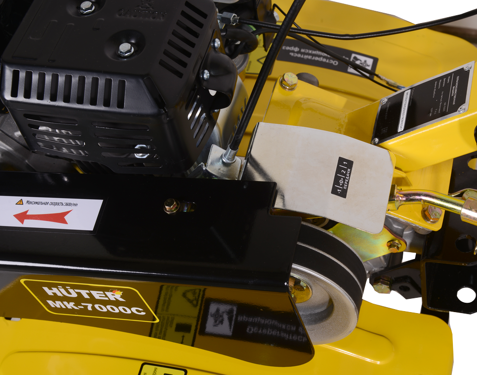 Высокую производительность сельскохозяйственной машины обеспечивает мотор мощностью 7 л. с., работающий на бензине. Расход составляет 375 г/кВт в час. Благодаря этому, при полном баке вместительностью 3,6 л можно долго работать без остановок. Автоматический регулятор частоты вращения облегчает эксплуатацию HUTER МК-7000PС. Датчик уровня масла предупреждает случайные поломки, вызванные масляным голоданием.