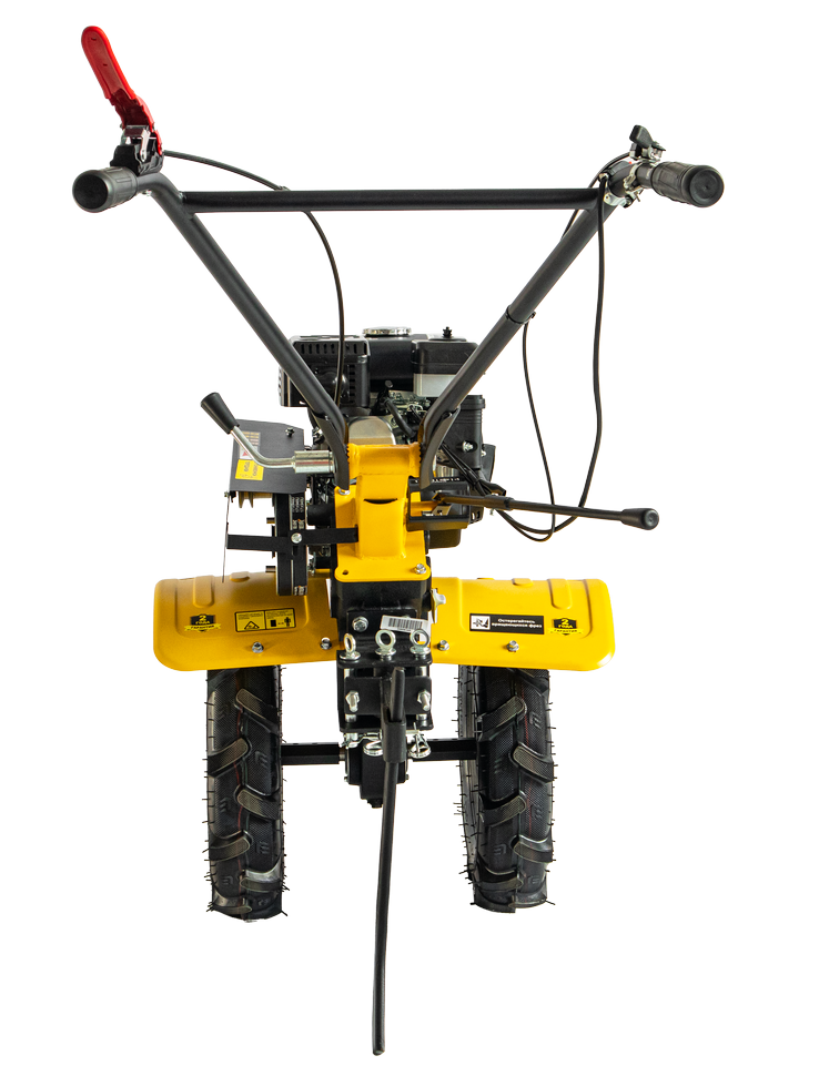 - Рукоятка регулируется по высоте, поэтому мотоблок удобно использовать людям различного роста.