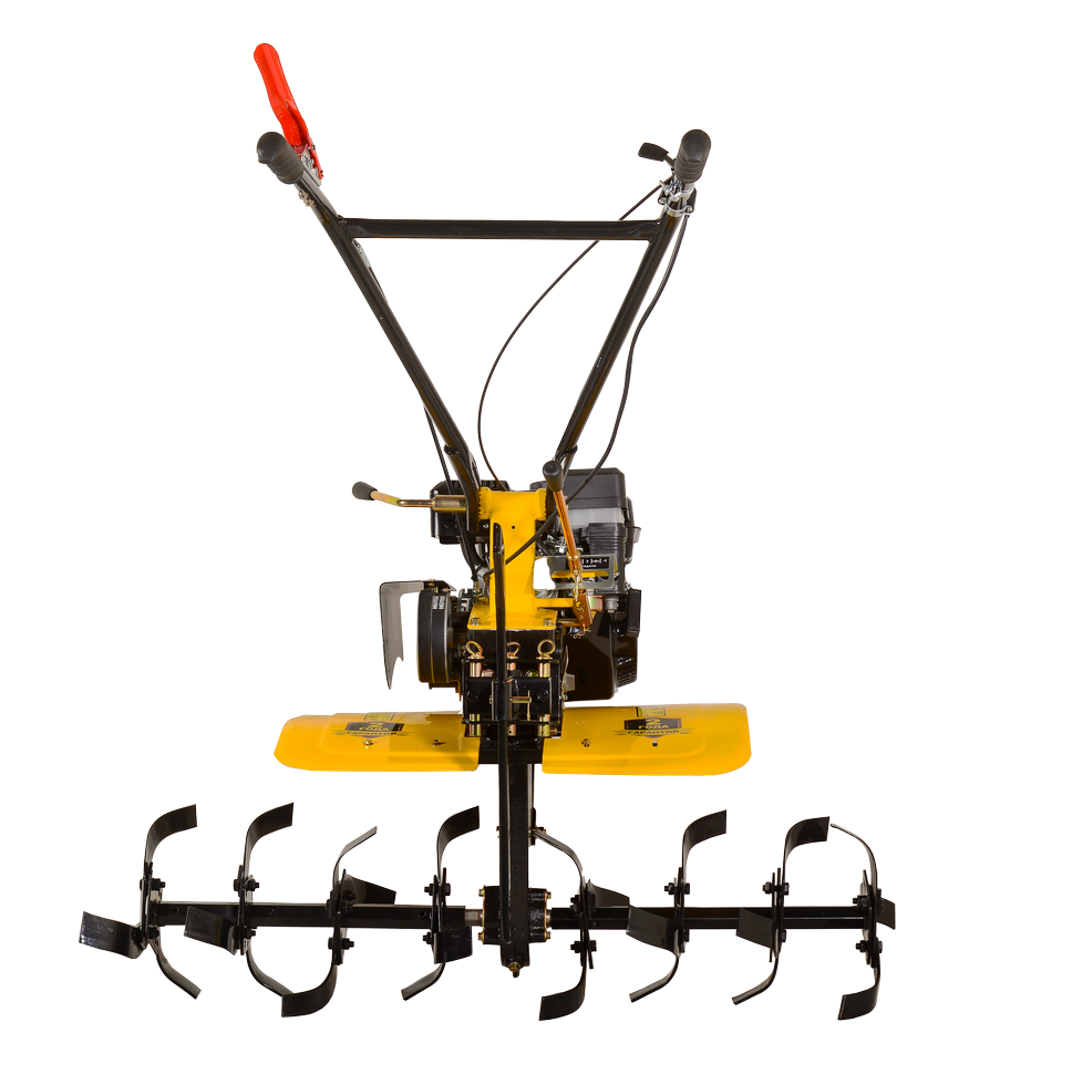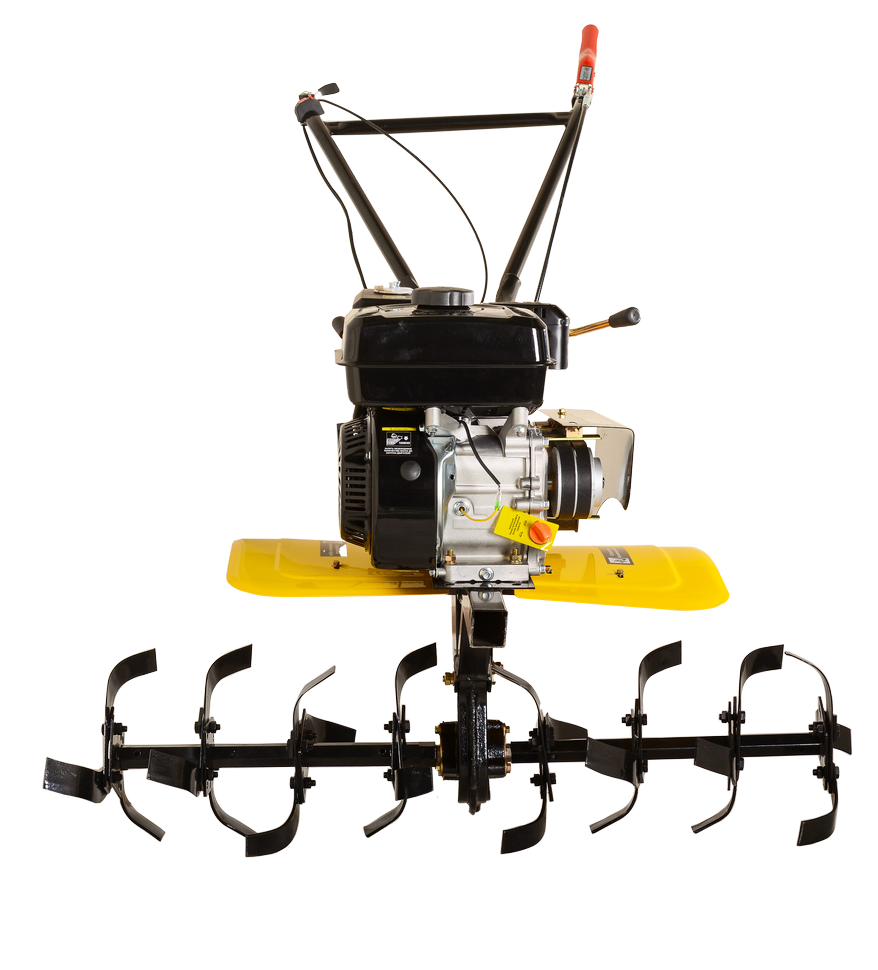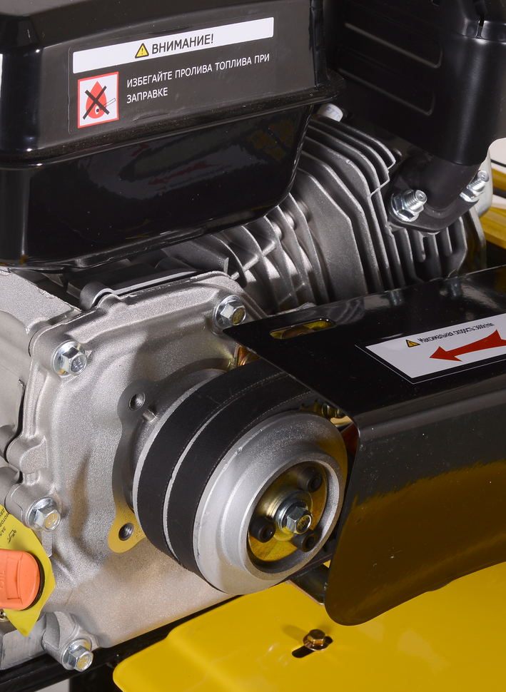 Устройство работает на базе одноцилиндрового бензинового двигателя мощностью 7,8 л. с. с расходом топлива 375 г/кВт в ч. Вместительный топливный бак на 3,6 л позволяет вести непрерывные работы в течение нескольких часов. Пониженная первая передача улучшает проходимость агрегата, что особенно актуально на неровной вспаханной земле. Переключение передач осуществляется специальным рычагом, расположенным на корпусе. Наличие обратной передачи облегчает маневрирование тяжелым оборудованием. Сельскохозяйственная машина оснащена насадкой для культивации почвы. Глубина обработки составляет 30 см, ширина – 100 см. При желании к мотоблоку можно приобрести дополнительное навесное оборудование, это расширит его возможности. Конструкция оснащена колесами 19х7-8, удобными ручками с управлением на рукоятке.