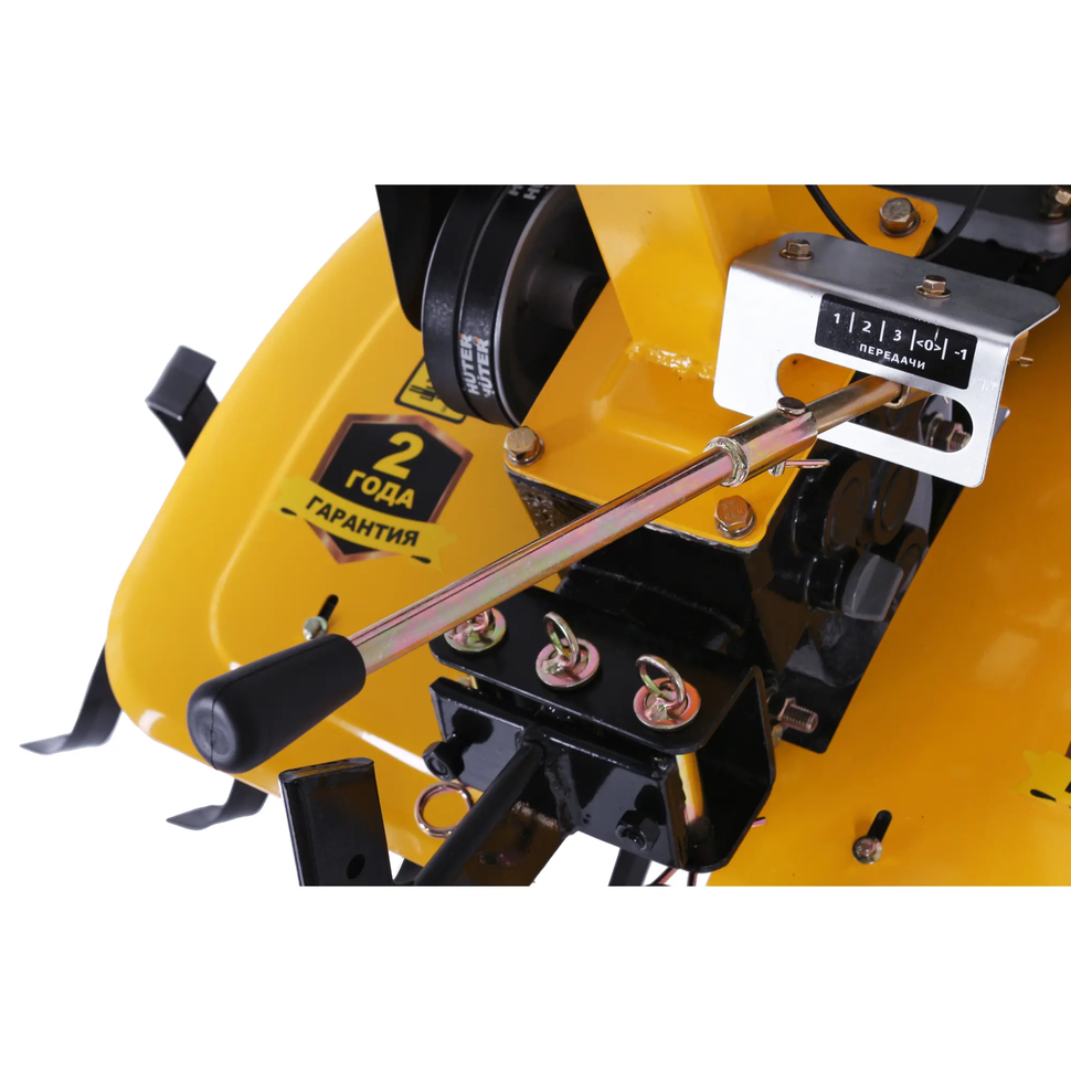 Машина имеет ширину обработки 100 см. Глубина регулируется сошником. Диаметр фрез: 30 см. Закаленные фрезы и наличие пониженной передачи позволяет справиться даже с устоявшимся дерном на плотной почве. У данной модели 3 передачи для движения вперед и 1 назад. Задняя передача позволяет легко извлекать мотоблок из грунта.