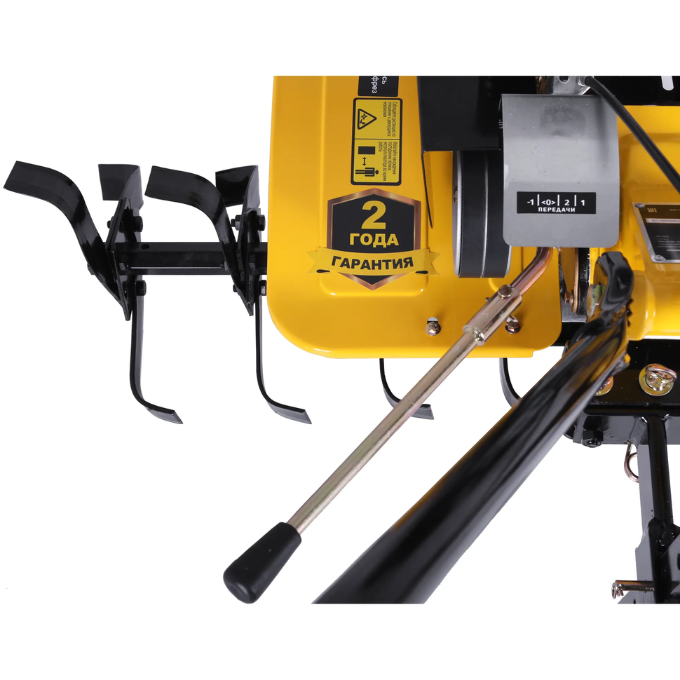 Модель имеет 3 передачи: 2 вперед, 1 назад. Наличие заднего хода не даст застрять агрегату в грунте. Мотоблок оборудован защитным щитком, предохраняющим оператора и бензодвигатель. Прорезиненные рукоятки создают комфорт при работе.