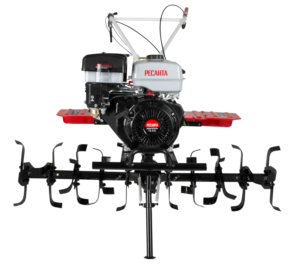 Мотоблок МБ-13000Р Ресанта – это мощная техника, которая упрощает обработку земли, хотя также может использоваться и для других целей, например, для перевозки грузов. За высокую производительность отвечает бензиновый двигатель мощностью 13 л. с. Модель отличается экономным потреблением топлива – всего 375 г/кВт в час. Благодаря тому, что бак вмещает 3,6 л, можно долгое время работать без дозаправки.
