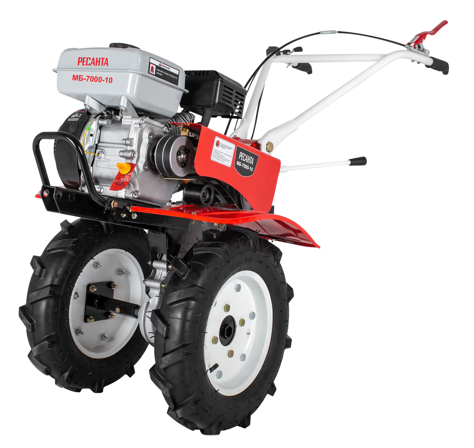 Мотоблок данной модели имеет колеса с агрессивным протектором, поэтому легко справляется с перемещением грузов по любой поверхности, отличается хорошей проходимостью. Шестеренчато-цепной редуктор из алюминия обеспечивает надежную и бесперебойную работу. МБ-7000P-10 Ресанта имеет широкие крылья, которые защищают оператора от попадания посторонних предметов. Датчик уровня масла предупреждает работу «на сухую» и поломки, связанные с этим.