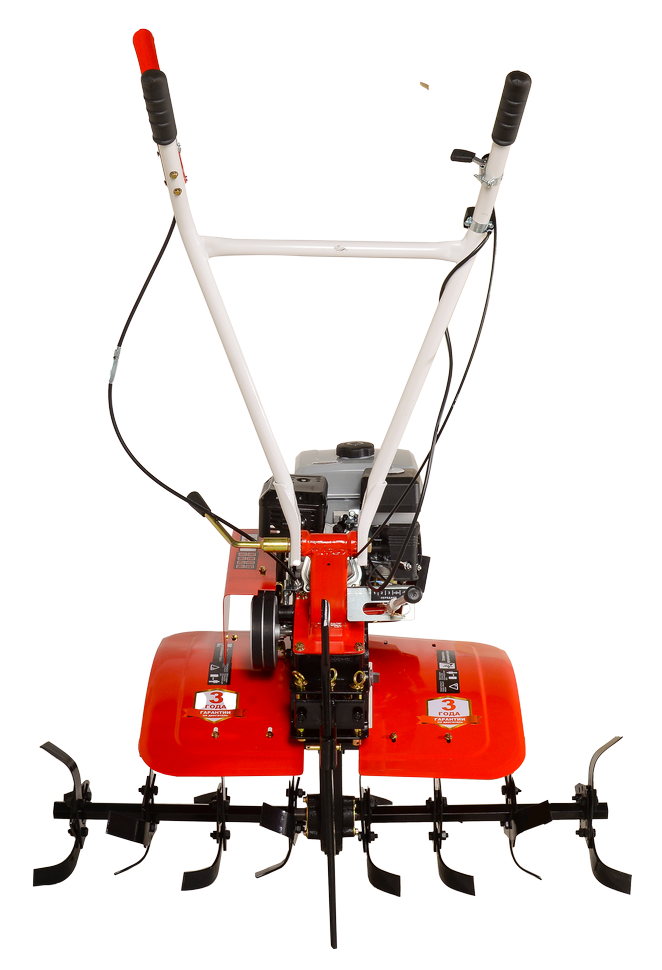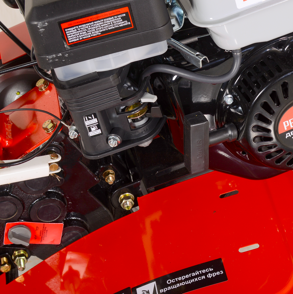 Ременное сцепление отличается простотой обслуживания. Замена ремня не требует специальных навыков и инструментов. Вращение вала осуществляет чугунный редуктор. Ширина культивации регулируется в зависимости от ландшафта и особенностей участка. Максимальный ее показатель равен 100 см. Диаметр фрез 30 см позволяет работать с разными типами грунта. Воздушный фильтр расположен в масляной ванне, в которой оседает пыль во время работы. Это продлевает срок службы двигателя и редуктора. Масло подлежит замене, а фильтр можно промывать, что позволяет экономить на расходниках.