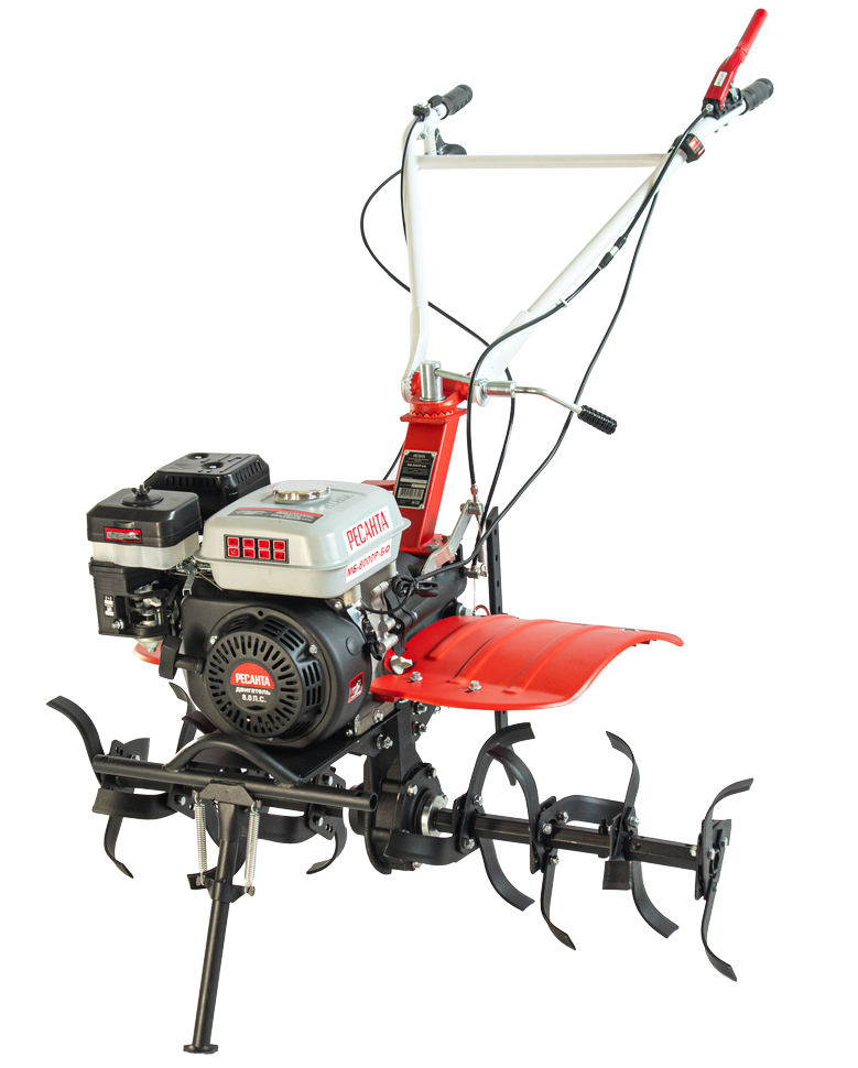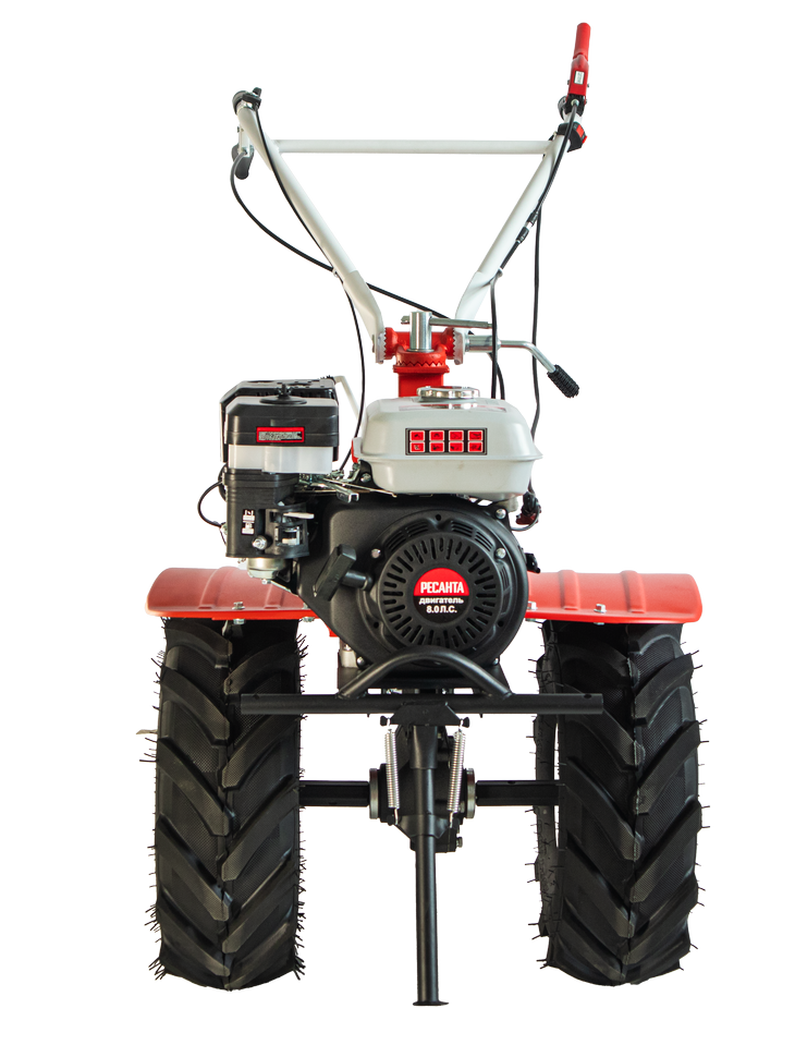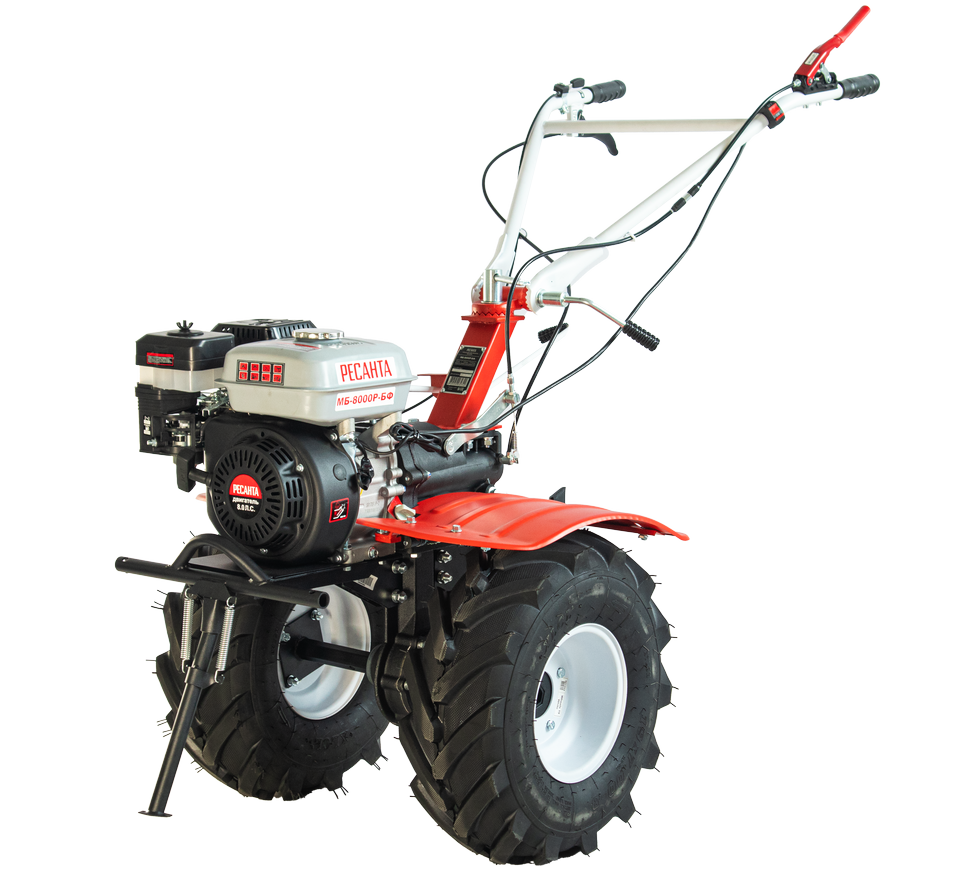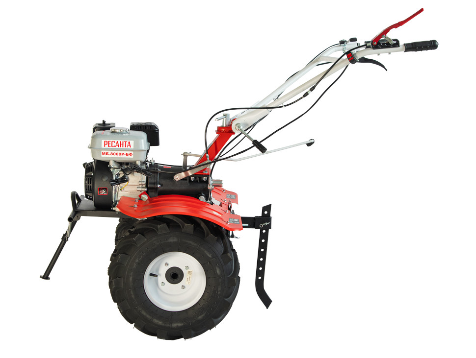 Возможность установки навесного оборудования превращает мотоблок Ресанта МБ-8000P-БФ в универсальную сельскохозяйственную машину. Она работает с плугом, бороной, окучником, косилкой, ворошилкой сена и другими орудиями. Для активной навески предусмотрен вал отбора мощности 14 мм. При установке навесного оборудования фрезы заменяются на колеса размером 19х7-8. Агрессивный рисунок в сочетании с глубиной протекторов обеспечивает максимальное сцепление на различных грунтах. Широкие крылья защищают оператора от летящих комьев земли.
