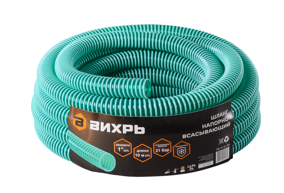 Шланг держит давление до 21 бар. Имеет диаметр 1" и длину 10 метров, что обеспечивает удобство в использовании и позволяет подключить его к различным насосам и другому оборудованию. Материал шланга экологически чистый, не содержит в составе кадмия, бария и свинца.