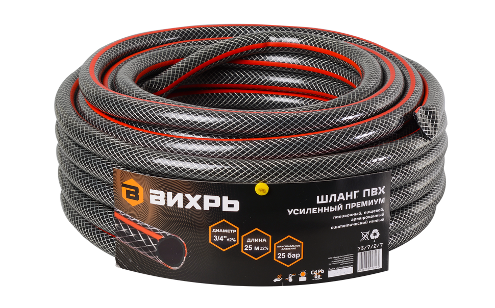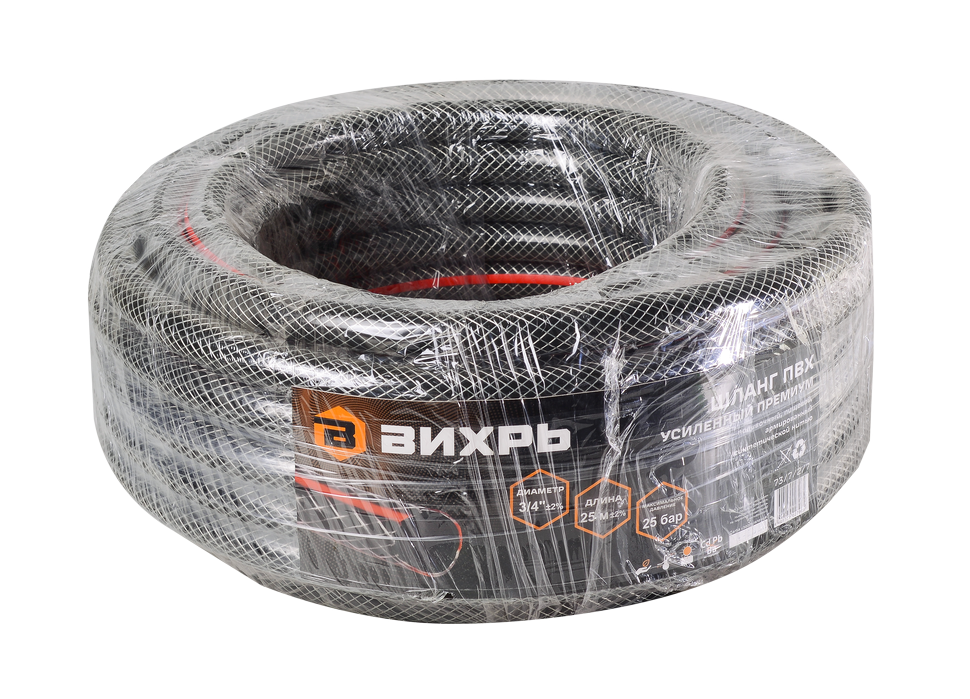 Шланг поливочный трёхслойный армированный Вихрь предназначен для подачи воды на дачных участках. ПВХ хорошо держит форму, не перекручивается. Шланг армирован синтетической нитью, держит давление 25 бар, диаметр 3/4 дюйма, длина шланга 25 метров.