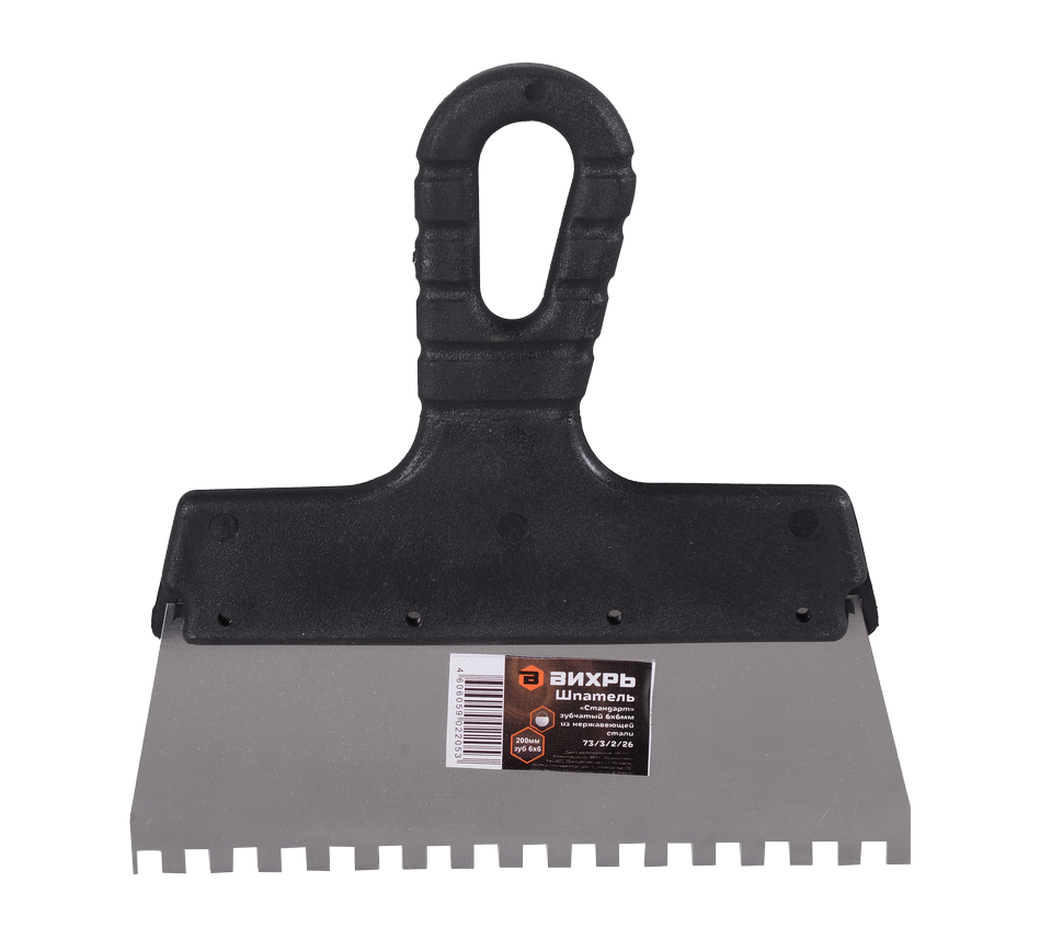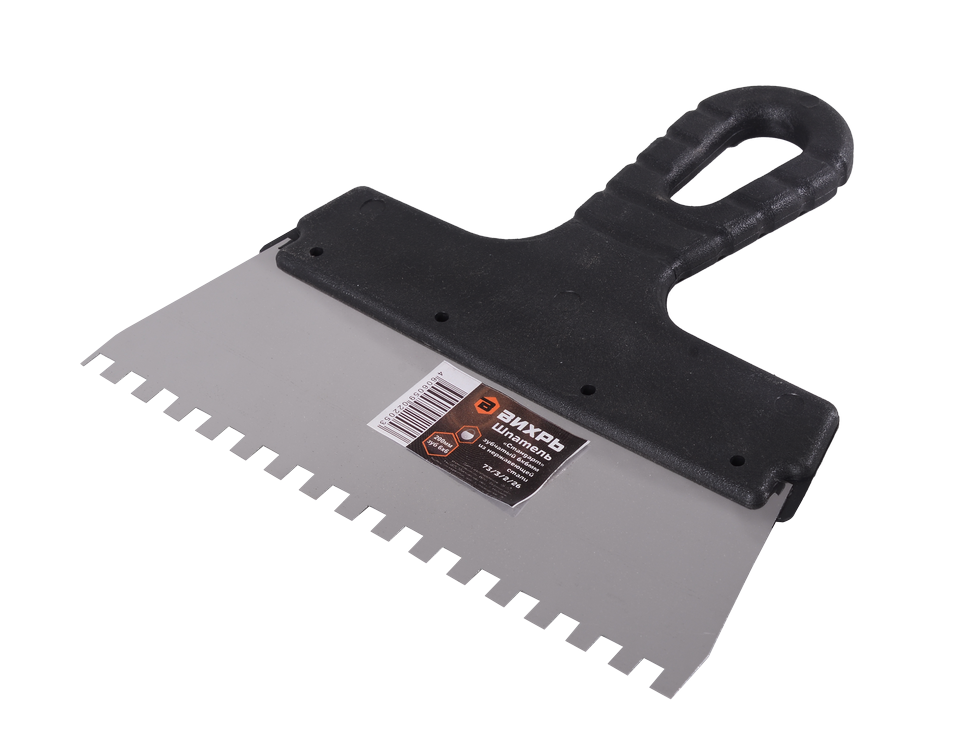 Шпатель зубчатый ВИХРЬ легок в использовании и обеспечивает высокую точность работы. Он идеально подходит для нанесения плиточного клея или цементного раствора.