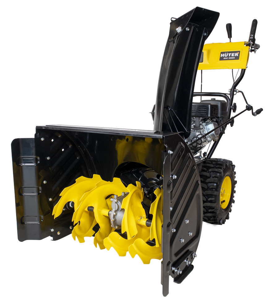Снегоуборщик Huter SGC 5500X - самоходный агрегат весом 76 кг. Отличается маневренностью и удобством управления. Модель оснащена двумя надувными шипованными колесами с глубоким протектором. Они обеспечивают качественное сцепление с поверхностью, уверенно перемещаясь по рыхлому снегу и обледенелым участкам. Рукоятка на панели управления позволяет изменять направление выброса снега на 190º. Дальность выброса достигает 15 м. Металлические детали устойчивы к образованию коррозии, обеспечивают длительный срок эксплуатации.