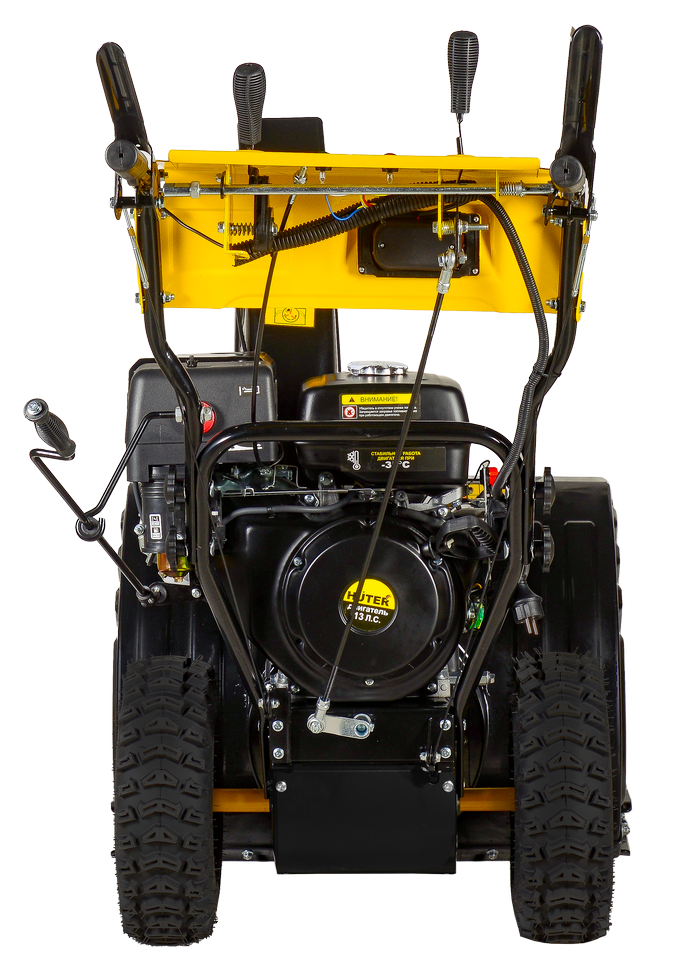 Управление устройством вынесено на панель и в зону ручек. Оператор может менять направление выброса снега, выбирать оптимальную скорость движения (6 вперед и 2 назад). Снегоуборщик оснащен двумя надувными колесами с глубоким протектором, исключающим скольжение при гололеде и облегчающим движение по рельефной местности. Наличие фары и подогрева ручек обеспечивает комфортность работы в любое время суток и при любой температуре воздуха.