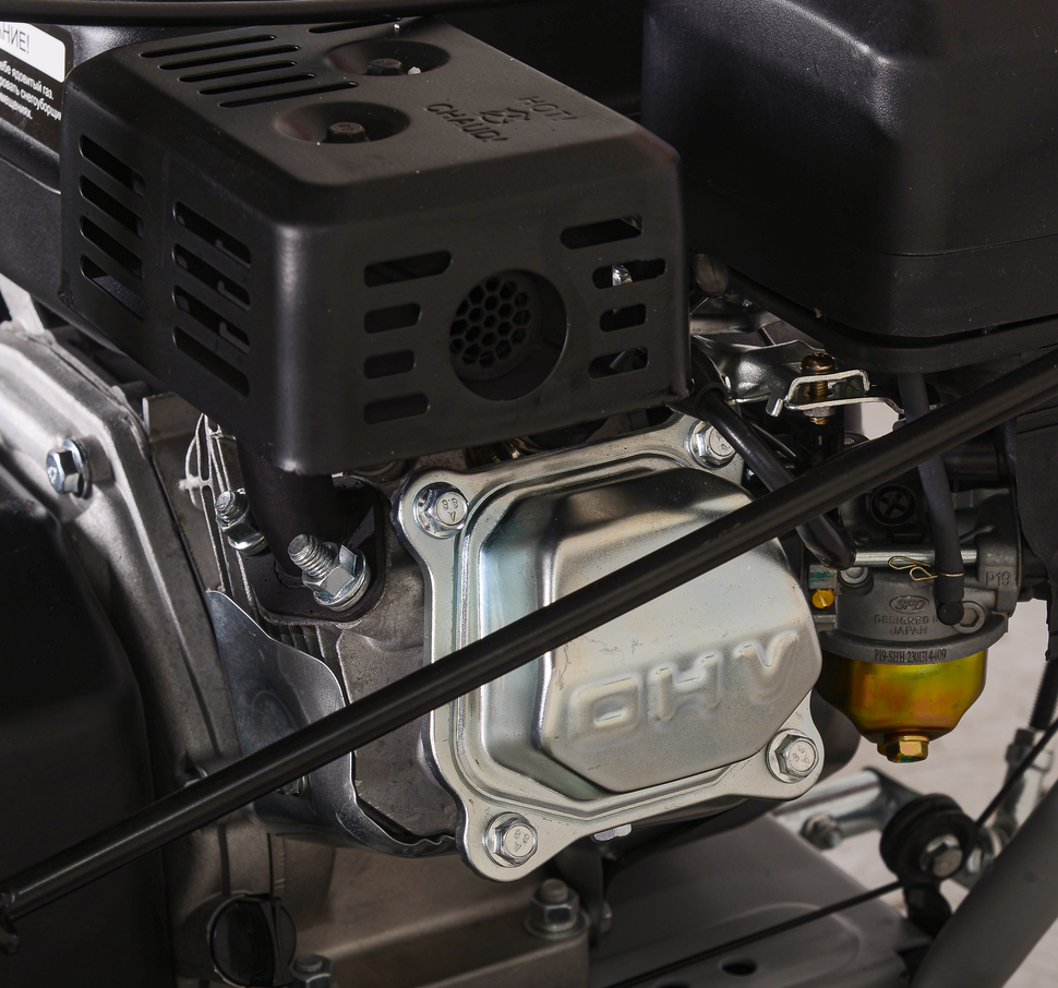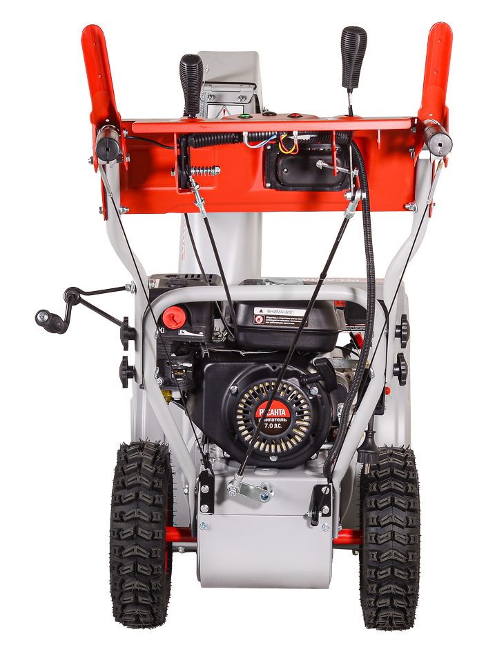 - Бензиновый двигатель мощностью в 7 л.с. справится с тяжелым снегом. Верхняя установка клапанов позволяет работать в морозные дни. А мобильность обеспечивается за счет топливного бака размеров в 3,6л.