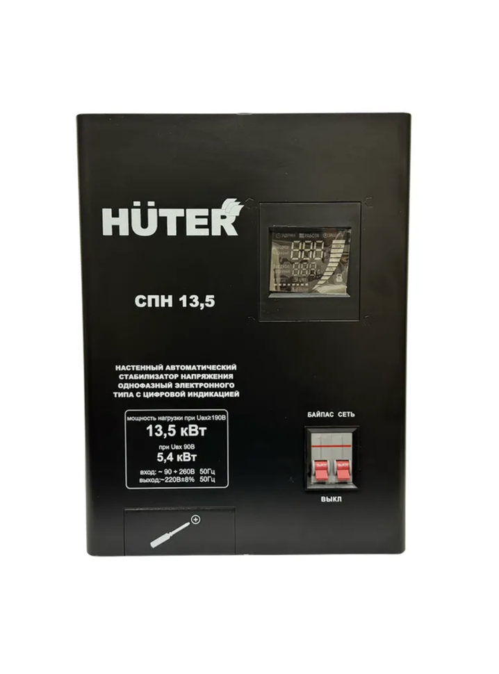 Стабилизатор напряжения Huter СПН-13,5 представляет собой настенную релейную модель, предназначенную для нормализации и поддержания стабильного однофазного напряжения 220 В в диапазоне от 90 до 260 В при рабочей частоте сети 50 Гц. Устройство обеспечивает мгновенный отклик и точное регулирование напряжения с погрешностью всего лишь ±8 %, выводя стабильное значение 220±8% В на выходе.