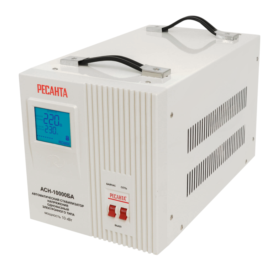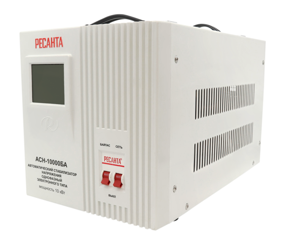 Стабилизатор напряжения Ресанта АСН-10000БА релейного типа защищает от перепадов параметров электросети. Он эффективен в условиях стабильно высокого или стабильно низкого напряжения и обладает высокой точностью выходного напряжения 220 В с погрешностью ±8%. Через стабилизатор рекомендуется подключать измерительные приборы и технику с электродвигателем.