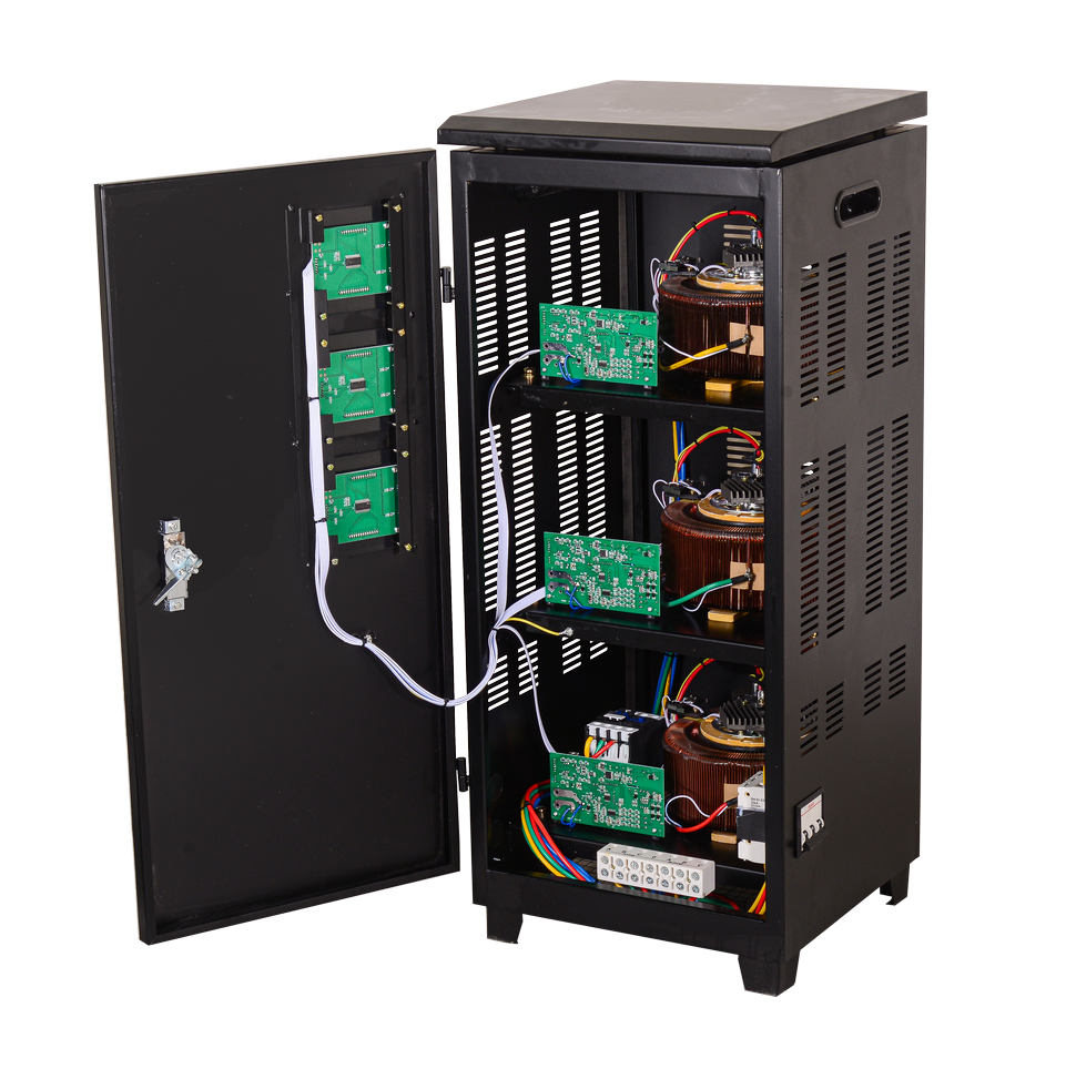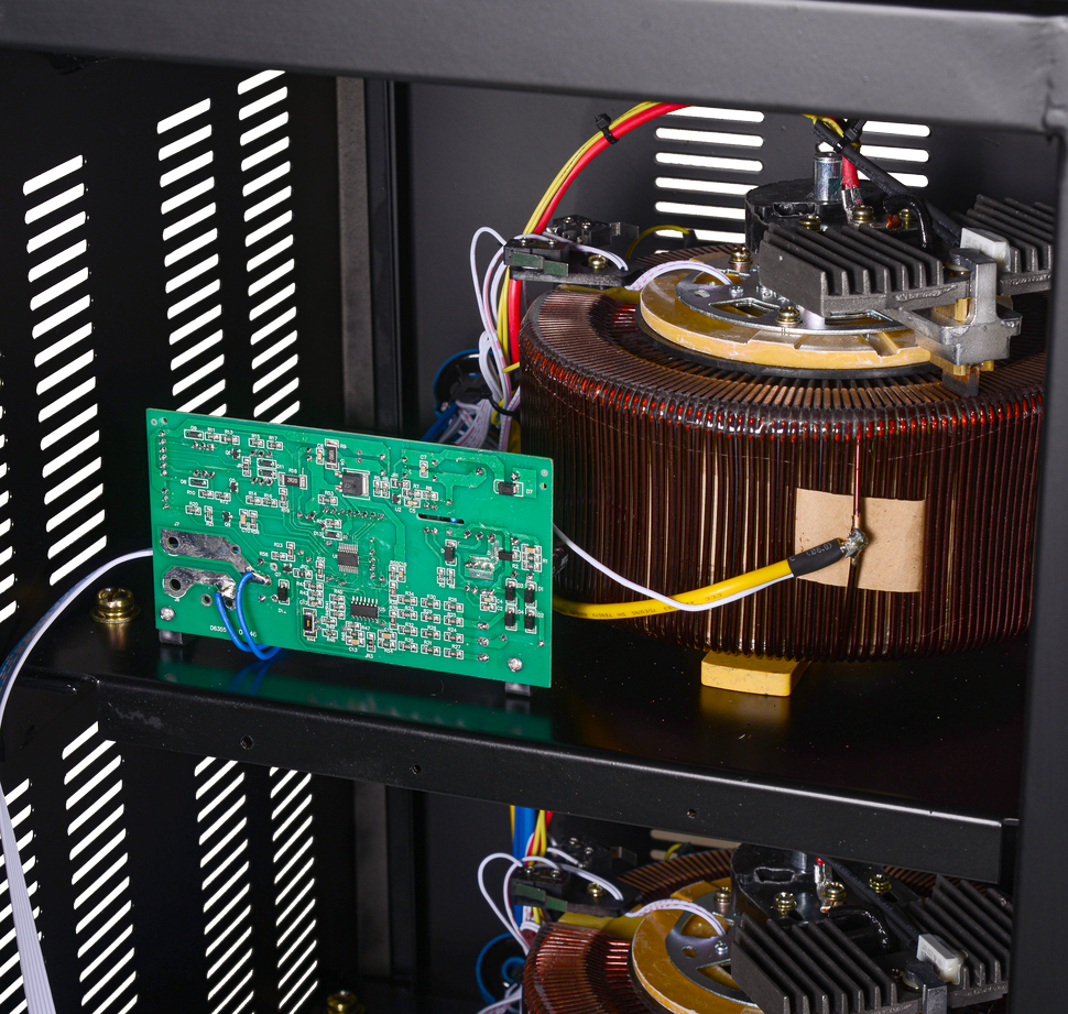 Преимущество электромеханического трансформатора заключается в постоянном контроле параметров сети, при котором напряжение измеряется на каждом витке рабочей обмотки. Это позволяет устройству быстро реагировать на любые изменения и стабилизировать параметры со скоростью 30 В/сек. Рабочий диапазон входного фазного напряжения составляет 140-260 В. При падении или превышении границ входного напряжения подача электроэнергии прекращается, пока стабилизатор напряжения не произведет корректировку. Для отслеживания текущих данных рекомендуется использовать цифровой дисплей. Установка заключена в прочный корпус, охлаждение осуществляется естественным путем через специально предусмотренные для этого решетки. В случае перегрузки трансформатор автоматически отключается.