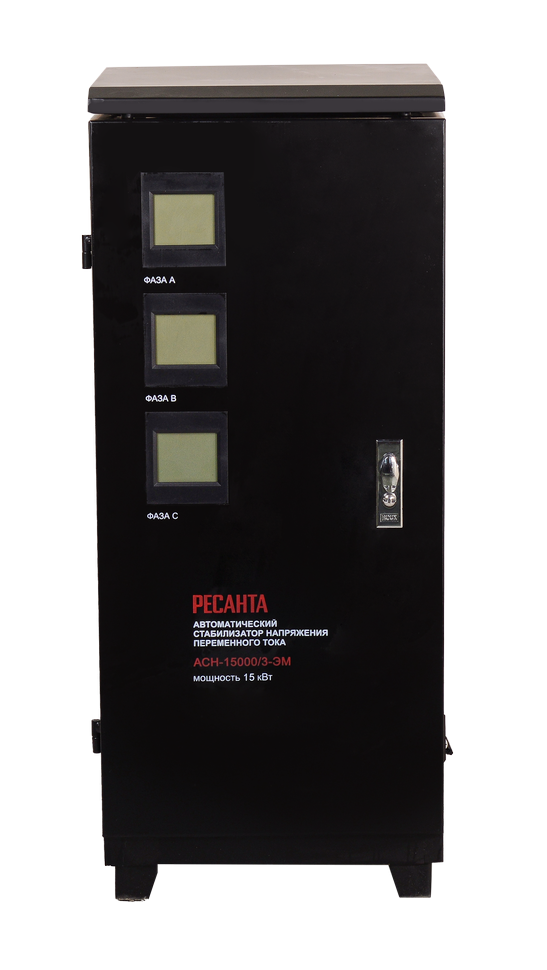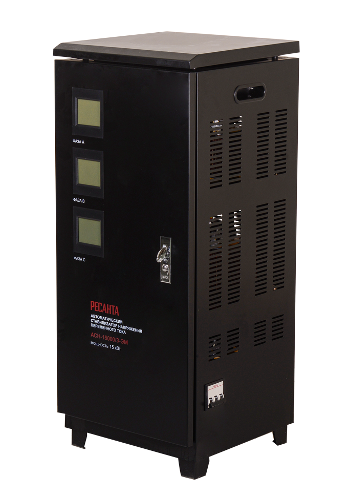 Трехфазный электромеханический стабилизатор напряжения Ресанта АСН-15000/3-ЭМ со встроенными фильтрами частотных помех, экраном, микропроцессорной системой управления и теплозащитой предназначен для корректировки входного напряжения и обеспечения стабильности работы электрооборудования мощностью до 15 кВт.