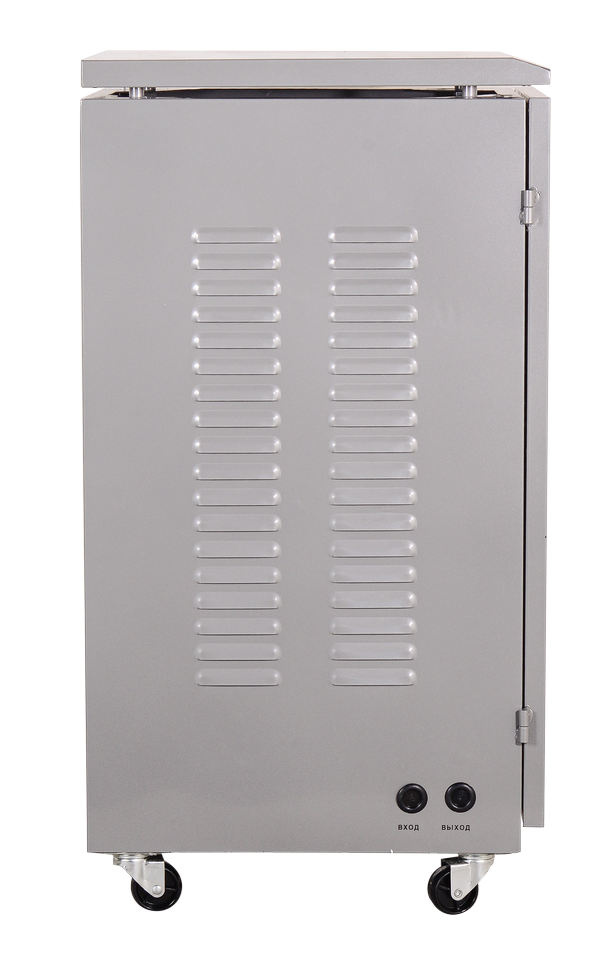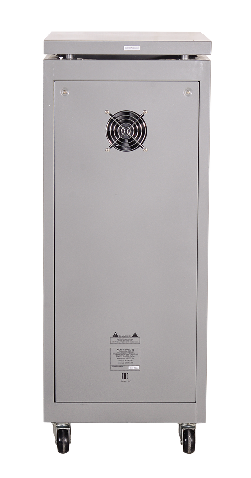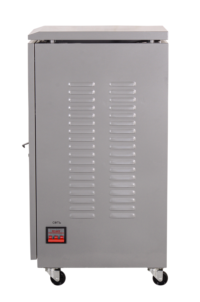 Напольный стабилизатор напряжения имеет колесики для удобства транспортировки. Информация о работе прибора выводится на цифровые дисплеи: показания вольтметра для каждой фазы, уровень нагрузки и другие индикаторы состояния. Предусмотрены защиты от перегрева, перегрузки, высоковольтных скачков, короткого замыкания, выхода напряжения за предельные нормированные значения, обрыва фазы и нуля.