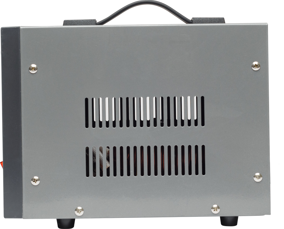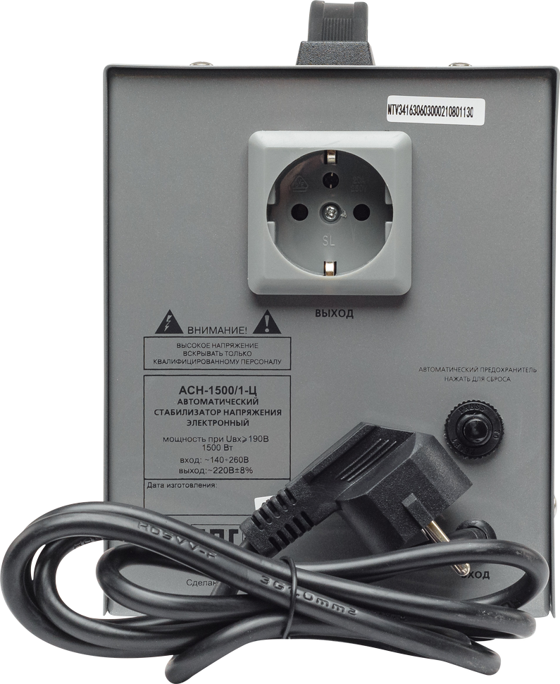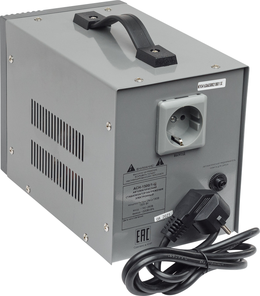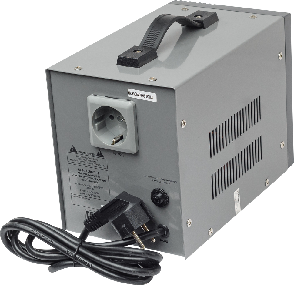 Однофазная модель АСН-1500/1-Ц имеет большой диапазон входного напряжения: от 140 до 260 В. Наличие LED-дисплея позволяет отслеживать текущие параметры сети. Стабилизатор напряжения охлаждается естественным путем, в случае перегрева срабатывает система защиты и происходит отключение системы. Устройство отличается небольшими размерами, для удобства переноски в крышку корпуса вмонтирована ручка.
