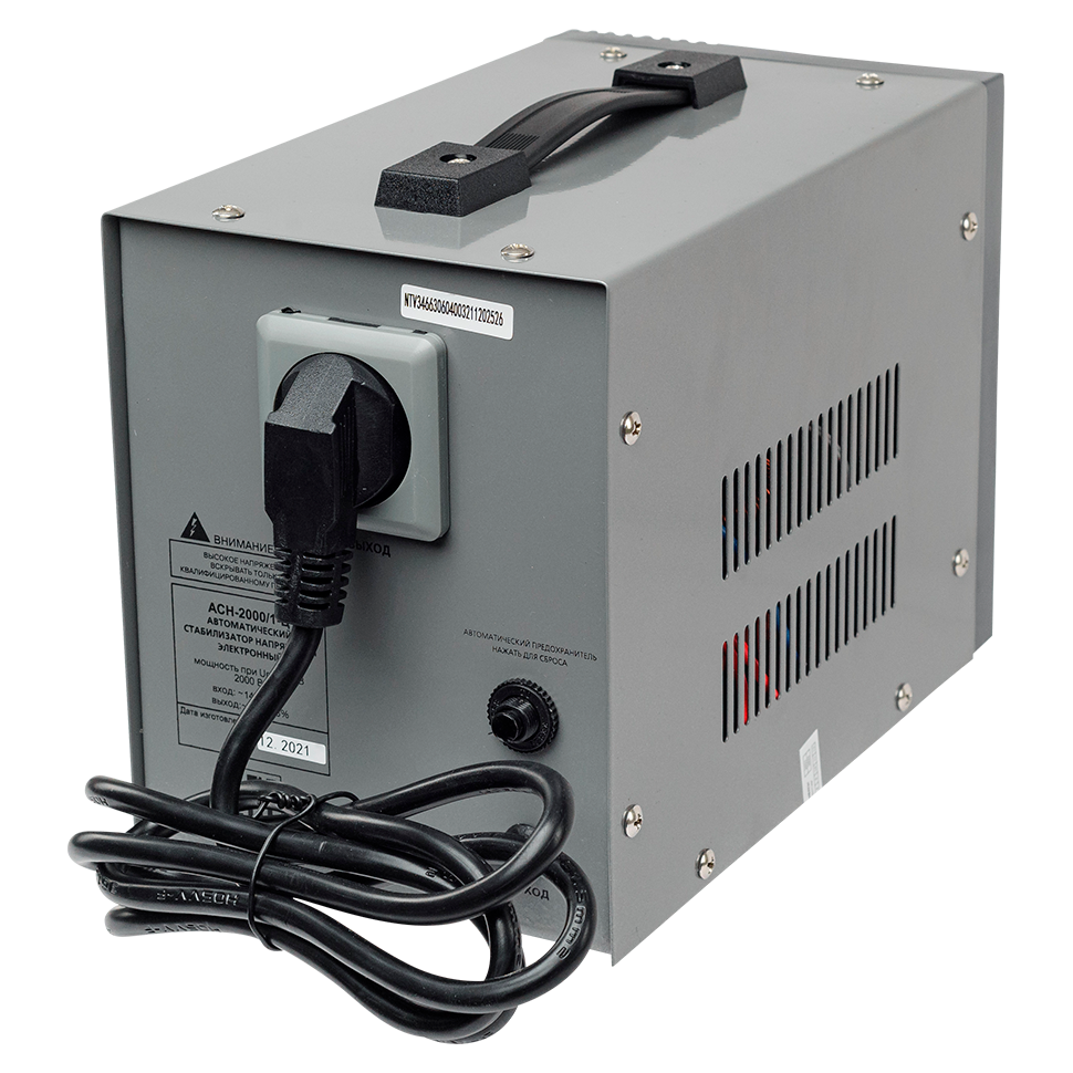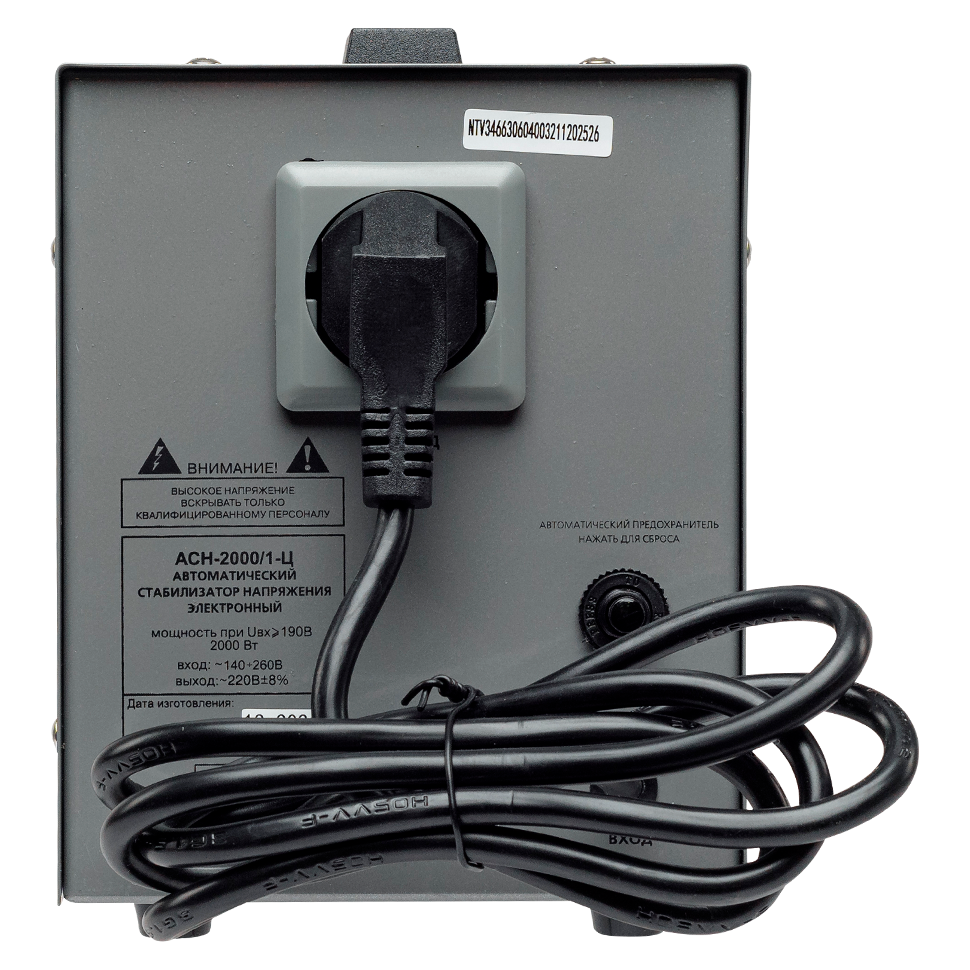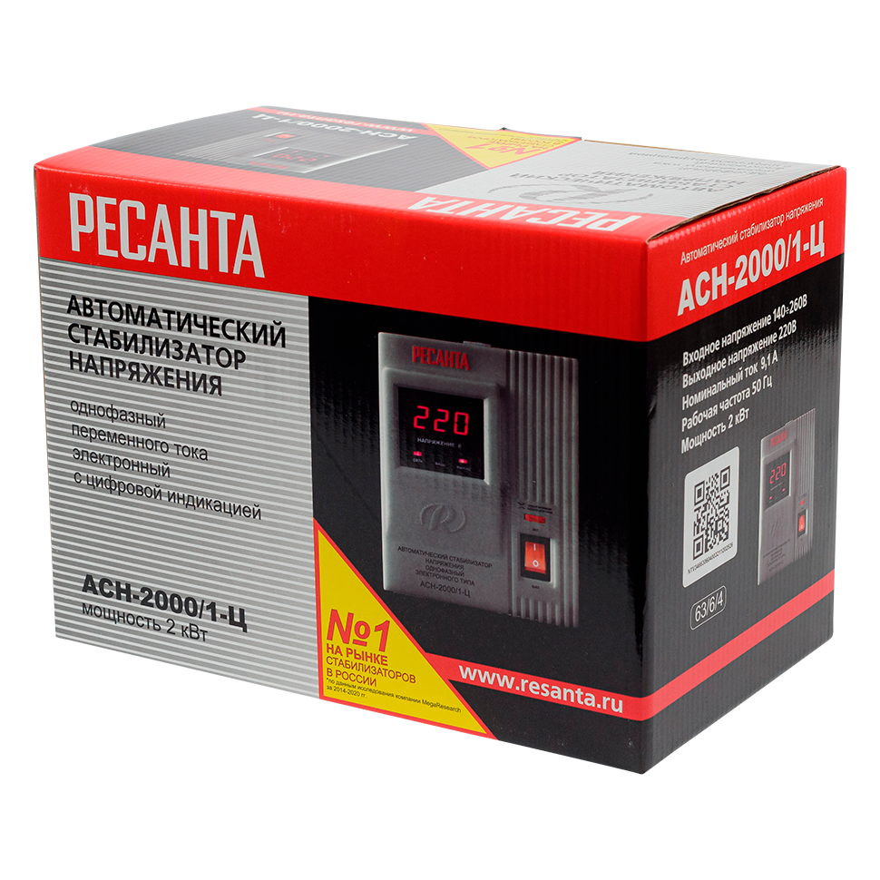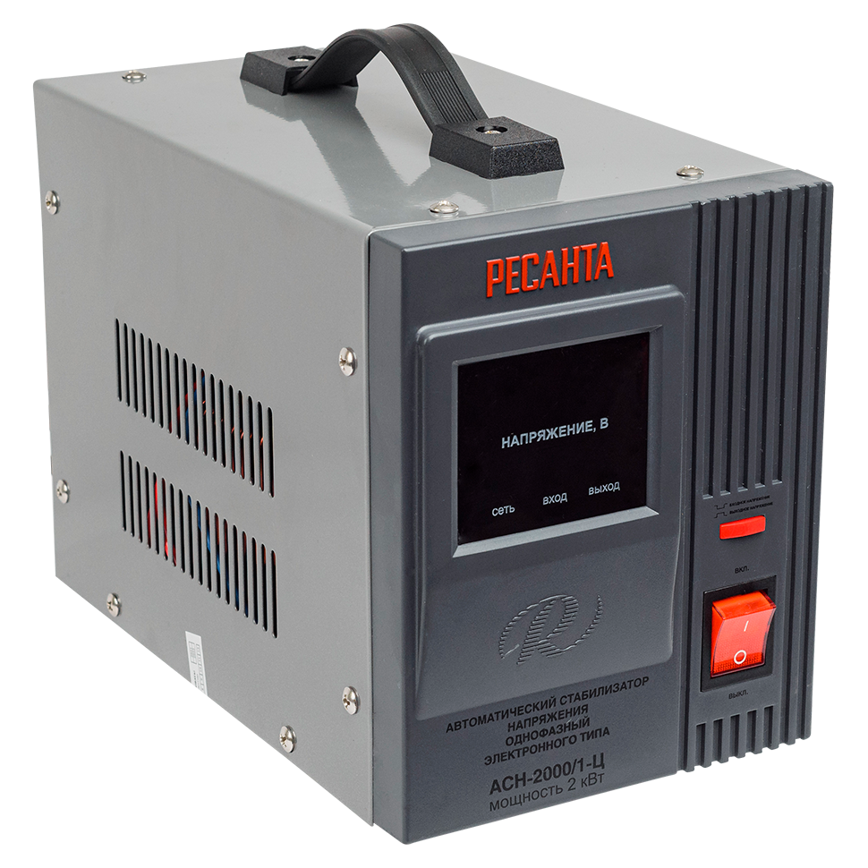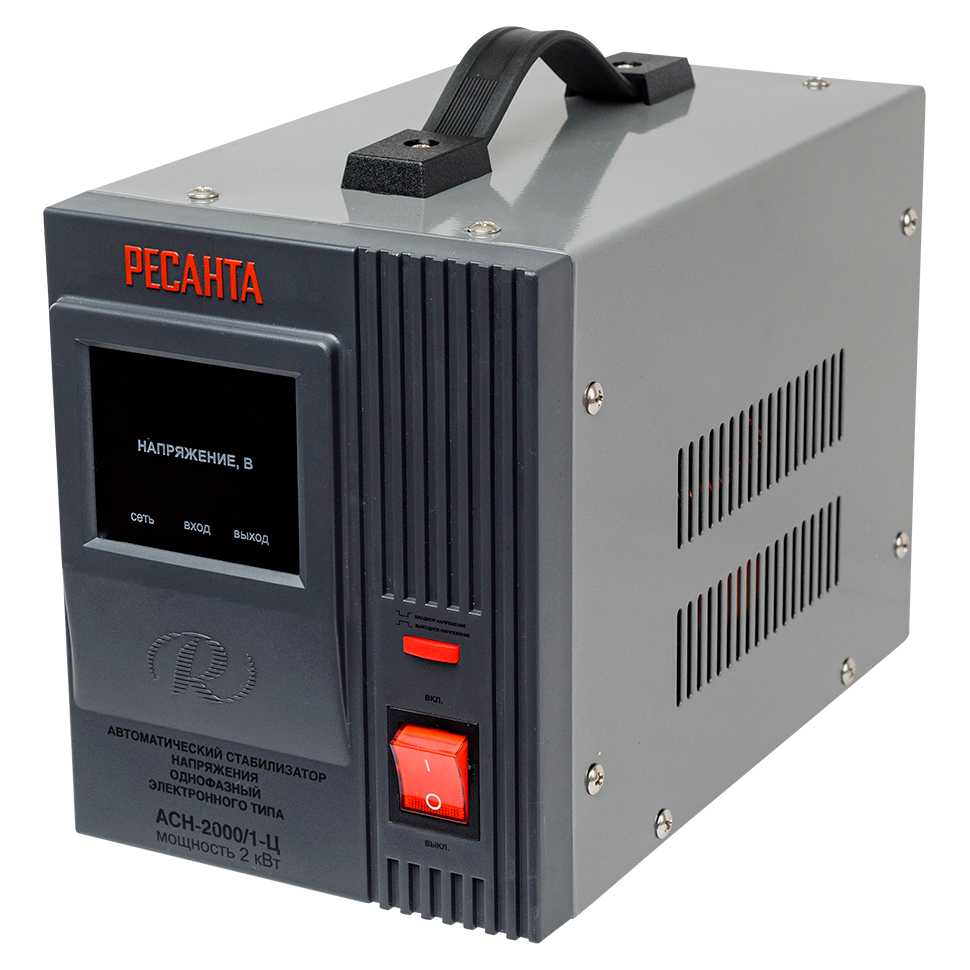 Стабилизатор напряжения Ресанта АСН-2000Н/1-Ц относится к релейному типу, выравнивает выходящее напряжение до 220±8% и защищает от его перепадов подключенные в сеть приборы, суммарно потребляющие не более 2 кВт.