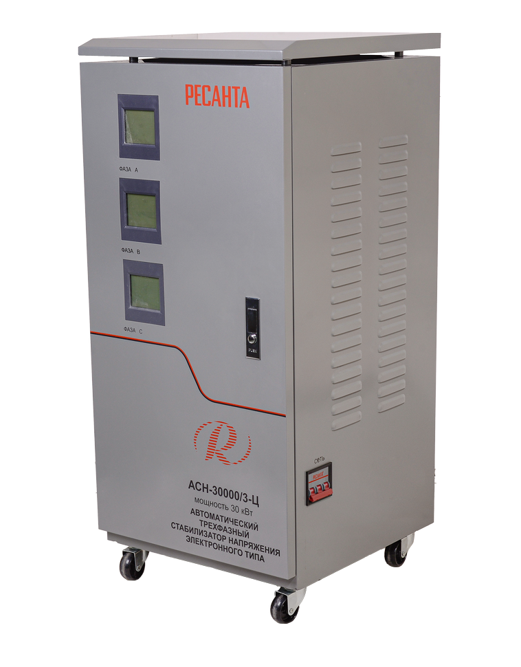 Мощная, надежная, удобная в использовании модель Ресанта АСН 30000/3-Ц станет оптимальным выбором для помещений с большим количеством электрического оборудования. Она обеспечит стабильную работу приборов, защитит их от выхода из строя из-за нестабильности параметров сети.