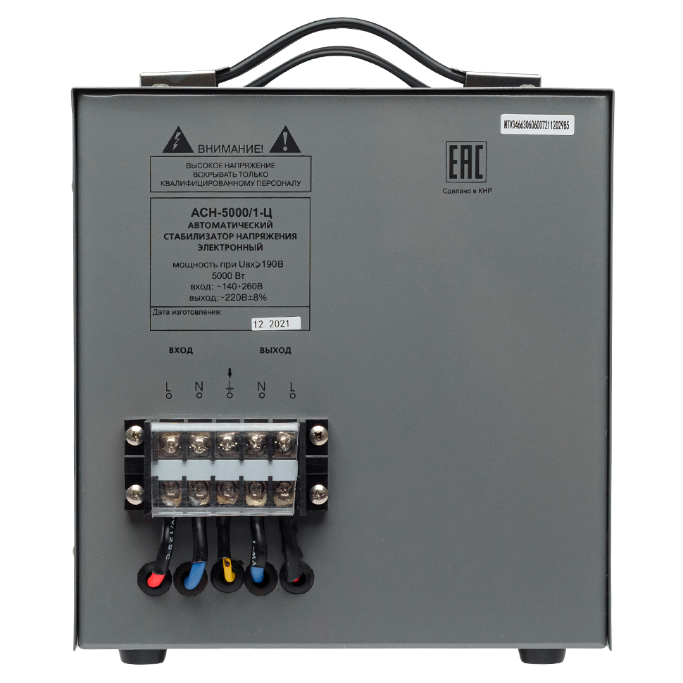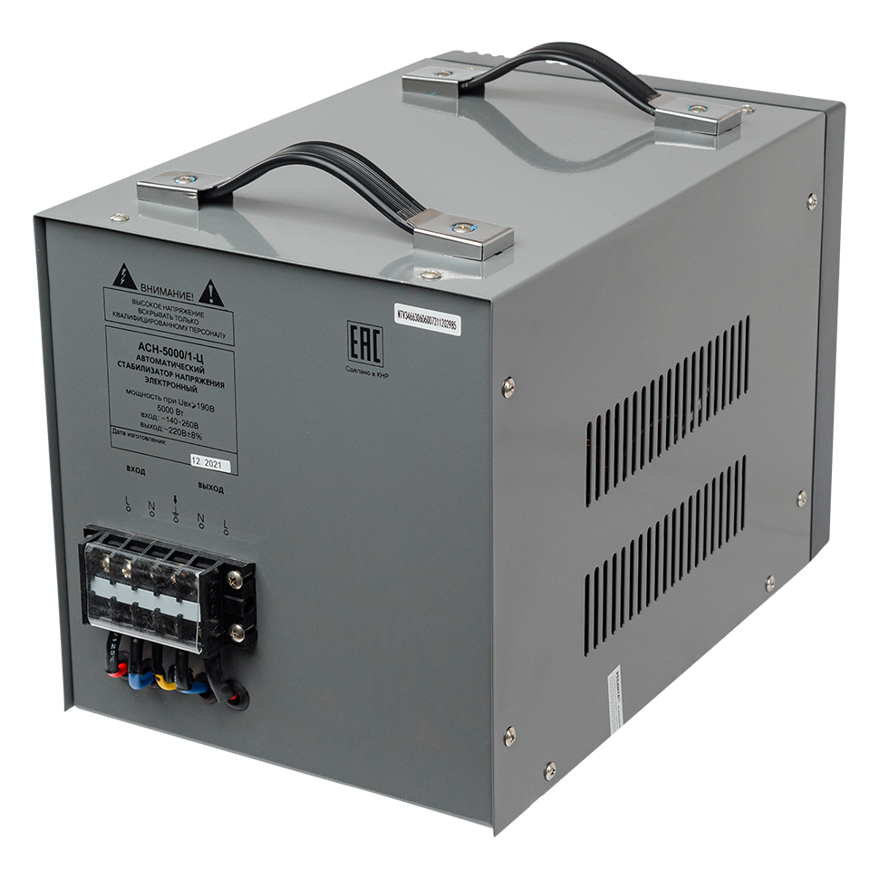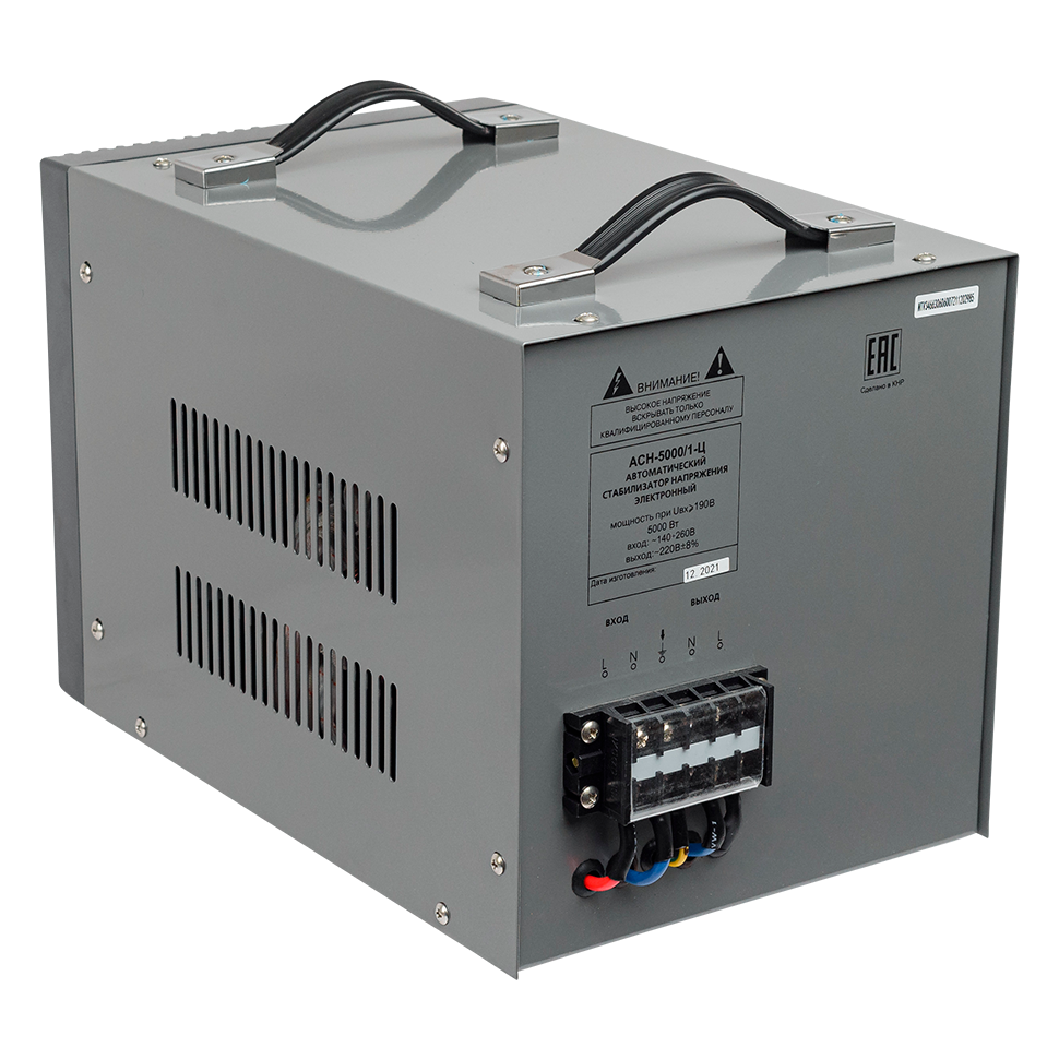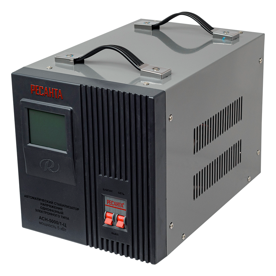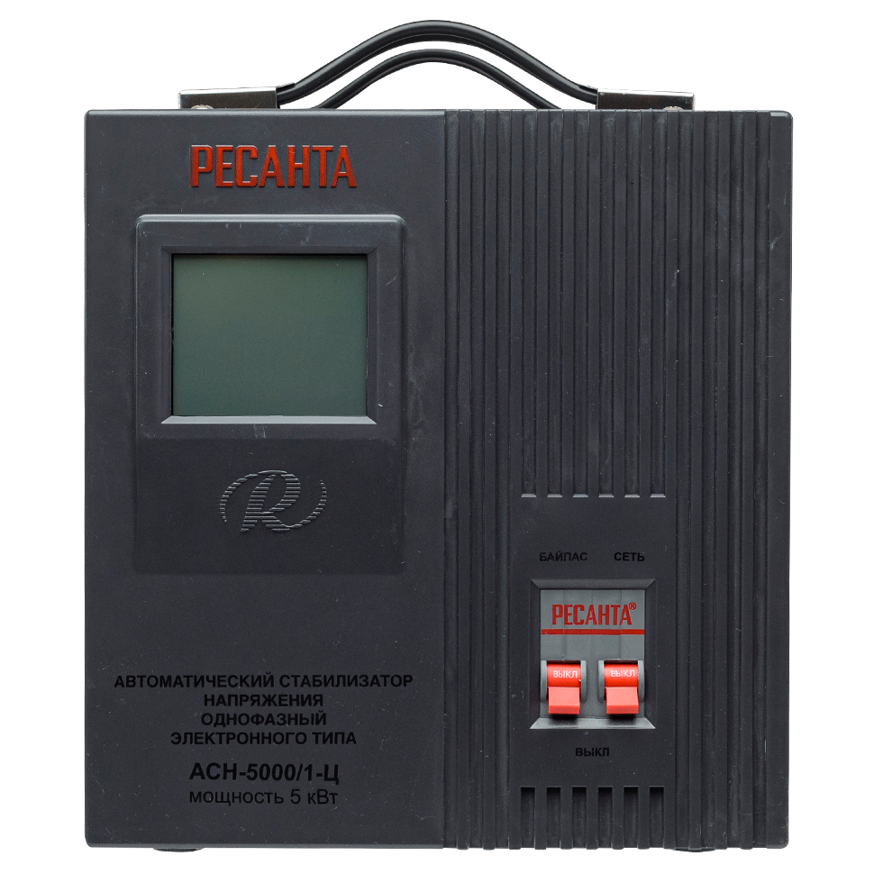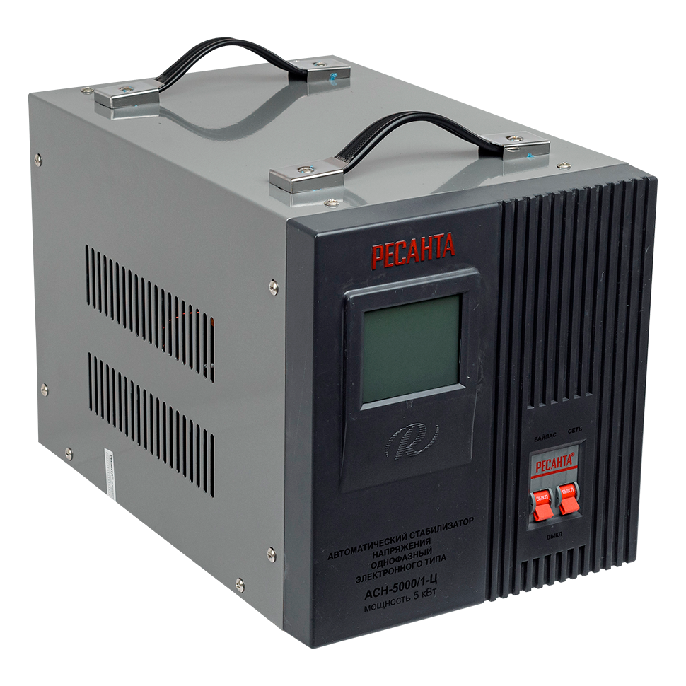 Стабилизатор напряжения Ресанта АСН-5000/1-Ц используется для однофазной сети в бытовых целях и на производстве. Эффективно защищает электроприборы от поломок вследствие колебаний и скачков напряжения. Индикаторы встроенного жидкокристаллического дисплея отображают важные характеристики защиты нагрузок прибора: напряжение на входе и на выходе, включение системы защиты, отображение величины напряжения самого устройства, а также обратный отсчет времени задержки. Компактные габариты, вес 9,7 кг и надежные ручки в верхней части корпуса обеспечивают удобство транспортировки. Прочный металлический каркас защищает внутреннюю автоматику от механических повреждений.