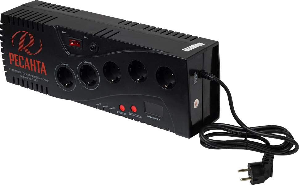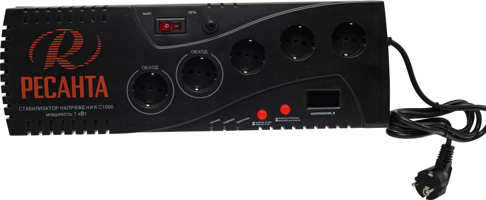 Стабилизатор напряжения релейного типа Ресанта С1000 - компактное устройство для защиты бытовой и офисной техники от перепадов напряжения и помех. На корпусе расположены 5 розеток европейского типа, предназначенных для подключения электрических приборов общей мощностью 1000 Вт. Устройство способно преобразовывать значительный диапазон напряжения на входе от 140 до 260 В. На выходе обеспечивает допустимое значение 220±8% В. Об эффективности работы прибора говорит его высокий КПД, составляющий не менее 97%. Время регулирования напряжения составляет менее 15 мс, что предотвращает выход бытовой техники из строя в случае нестабильного питания.