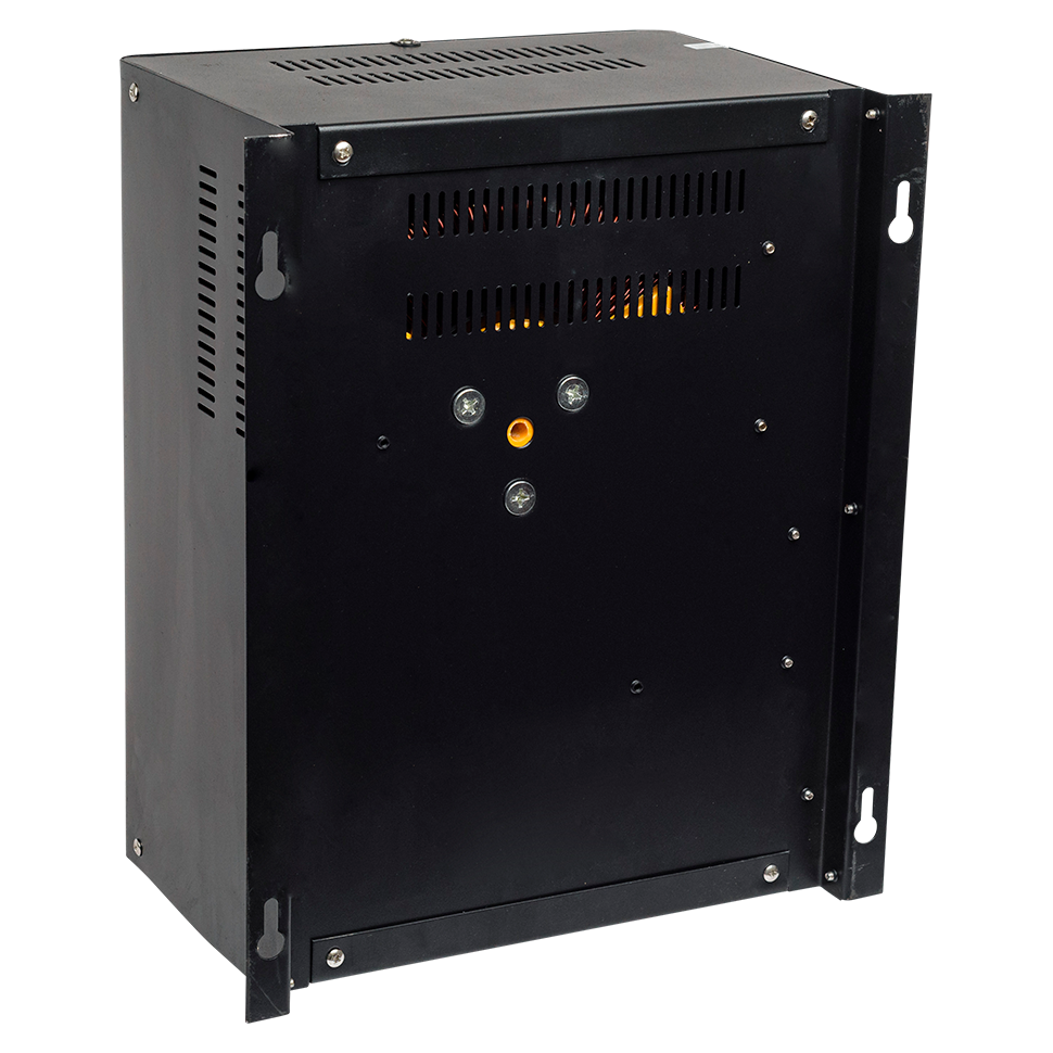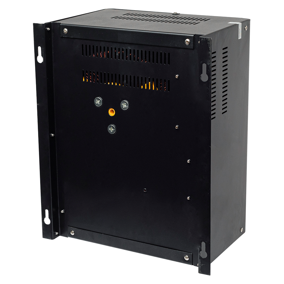 Корпус с защитой IP20 выполнен из металла, окрашенного в черный цвет. На переднюю панель выведены клеммный блок, кнопки включения и байпас, цифровой дисплей. На дисплее отображается входное и выходное напряжение, уровень нагрузки и индикаторы режима работы. Они информируют о понижении и повышении напряжения, перегрузке и перегреве. При срабатывании защит стабилизатор напряжения прекращает подачу электроэнергии, а при нормализации параметров сети автоматически включается.