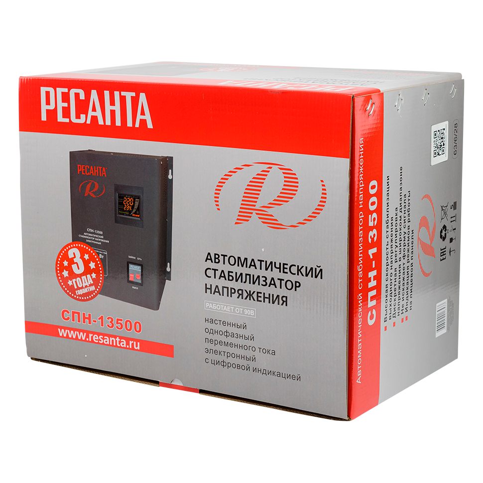 Стабилизатор напряжения Ресанта СПН-13500 настенного монтажа разработан для работы при стабильно пониженном входном напряжении в диапазоне 90 - 260 В. Справляется с частыми скачками параметров сети. Автоматический трансформатор реагирует на перепады менее, чем за 15 мсек. Подходит для подключения к сети сразу после распределительного щитка квартиры, дома, офиса или небольшого производства.