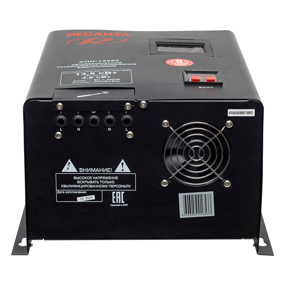 Для модели Ресанта СПН-13500 максимальная мощность потребителей составляет 13,5 кВт. Если она ниже, мощность стабилизатора пересчитывается с учетом максимальной силы тока 71 А. Выходное напряжение поддерживается на уровне 220±8% В. Фильтр сетевых помех предотвращает искажение синусоиды.