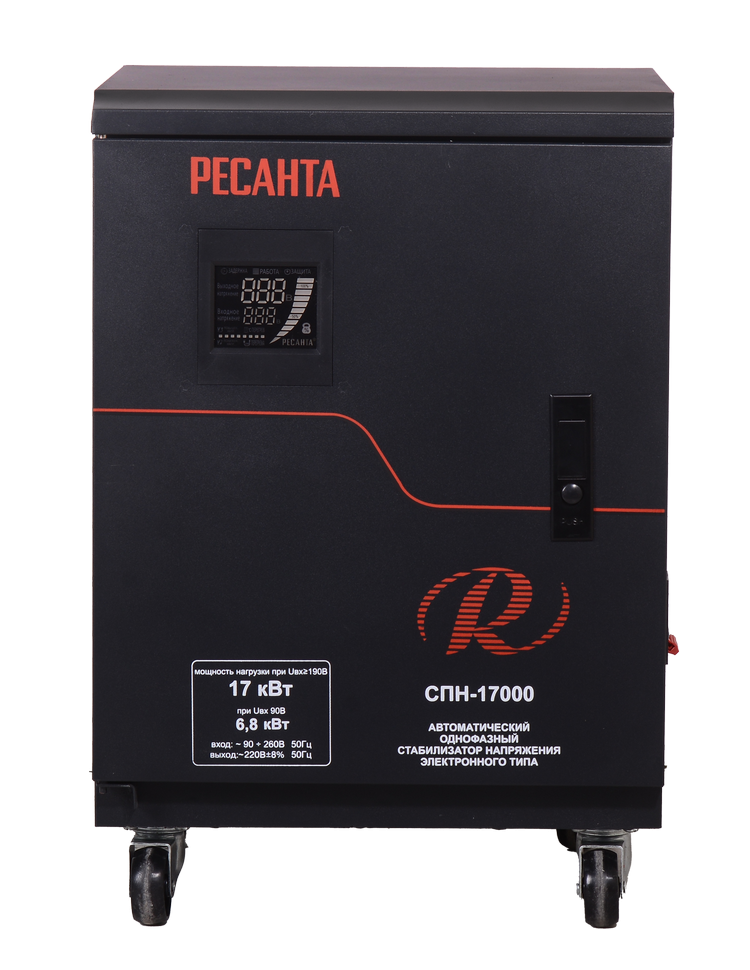 Стабилизатор напряжения Ресанта СПН-17000 предназначен для преобразования входного напряжения в диапазоне от 90 до 260 В. Менее, чем за 15 мс, прибор корректирует его до допустимых значений 220±8% В. Максимальная мощность 17000 Вт обеспечивает широкие возможности применения. Используется для однофазной сети. Расположенный на корпусе цифровой дисплей позволяет контролировать параметры работы устройства и значения напряжения. Сетевые фильтры избавляют от помех и исключают искажение частотной синусоиды. Благодаря микропроцессорному управлению устройство способно точно и быстро реагировать на любые изменения в работе.