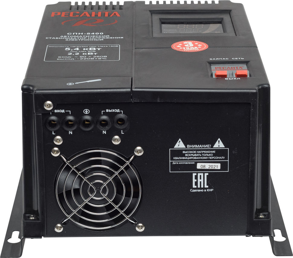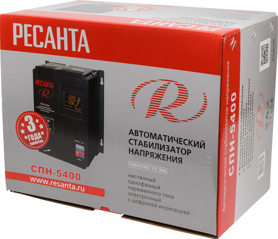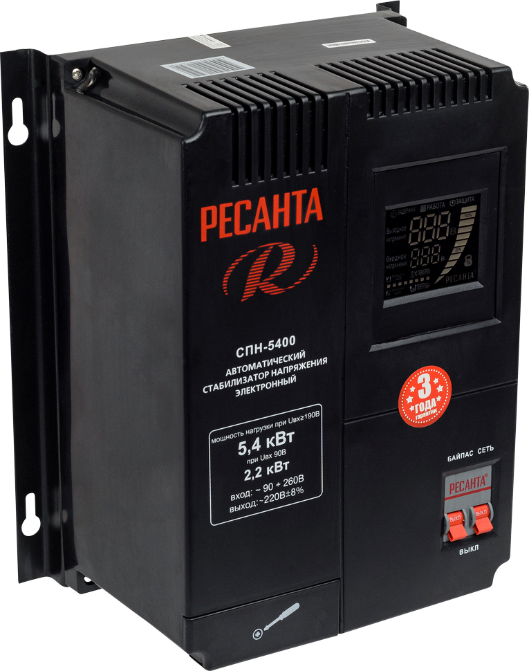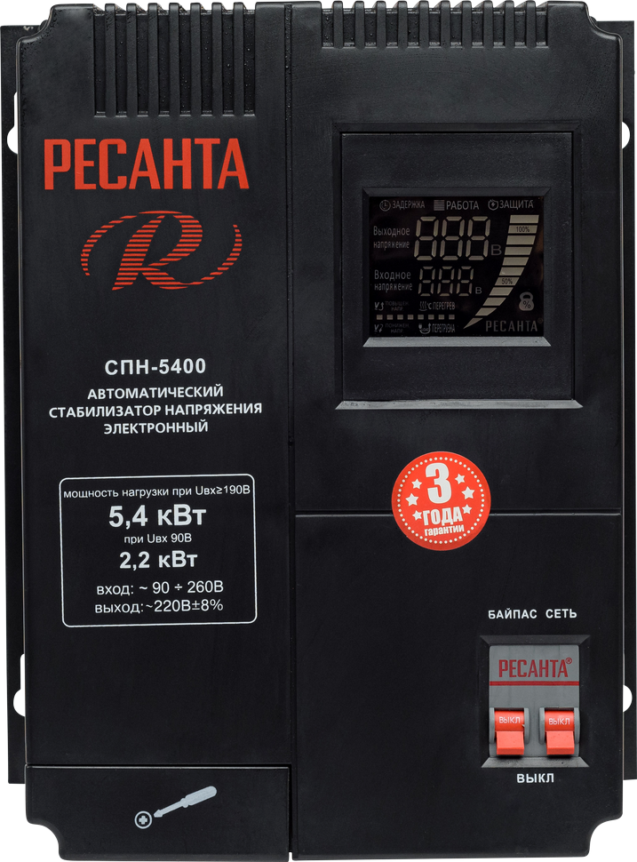 Ресанта СПН-5400 – модель однофазного релейного стабилизатора пониженного напряжения, основной задачей которого является выравнивание параметров электросети с целью защиты оборудования и бытовых приборов общей мощностью до 5400 Вт от поломки.