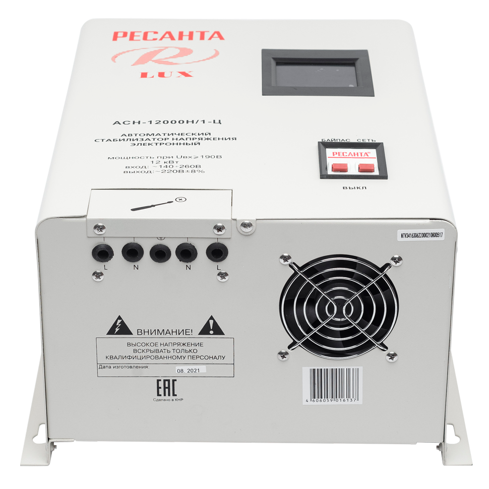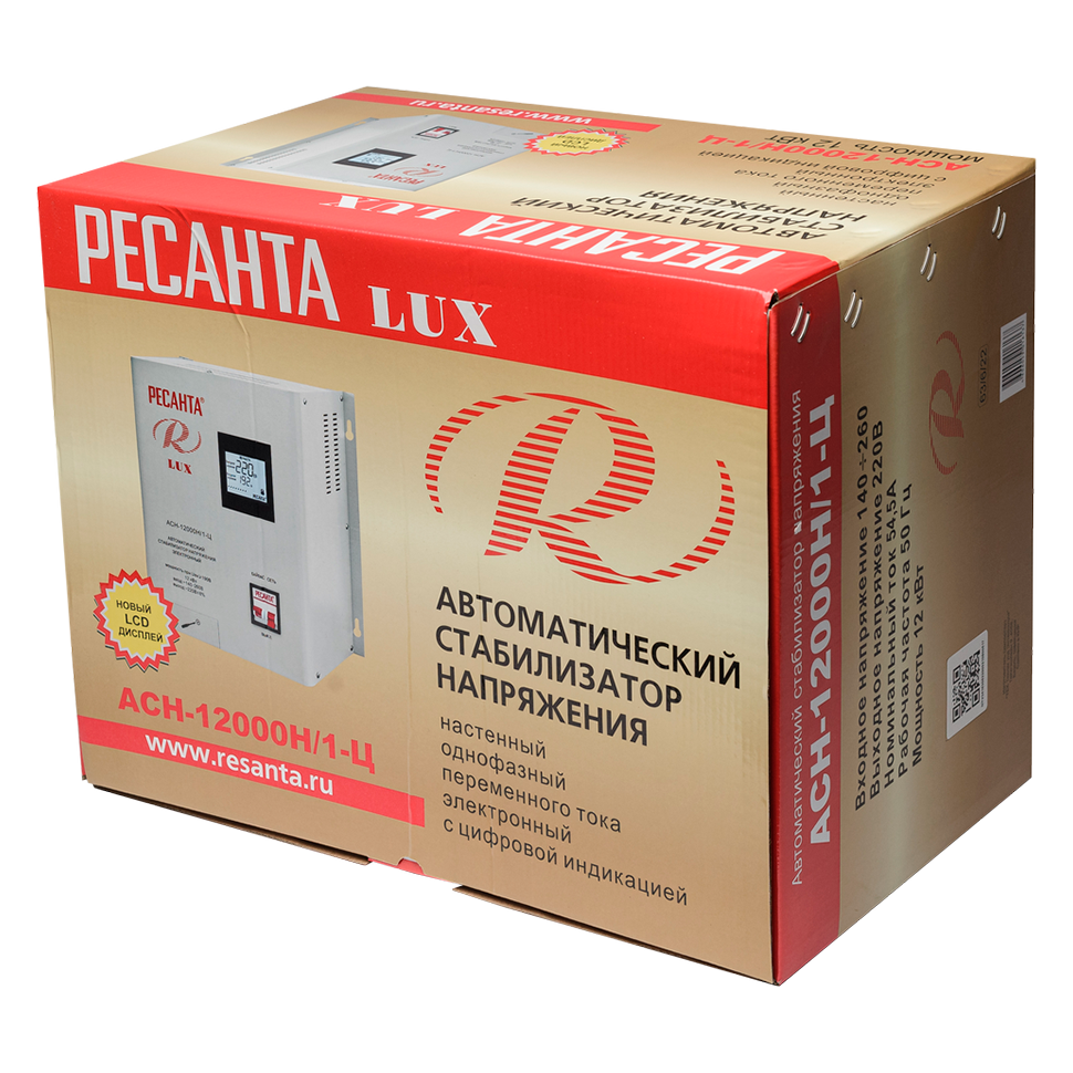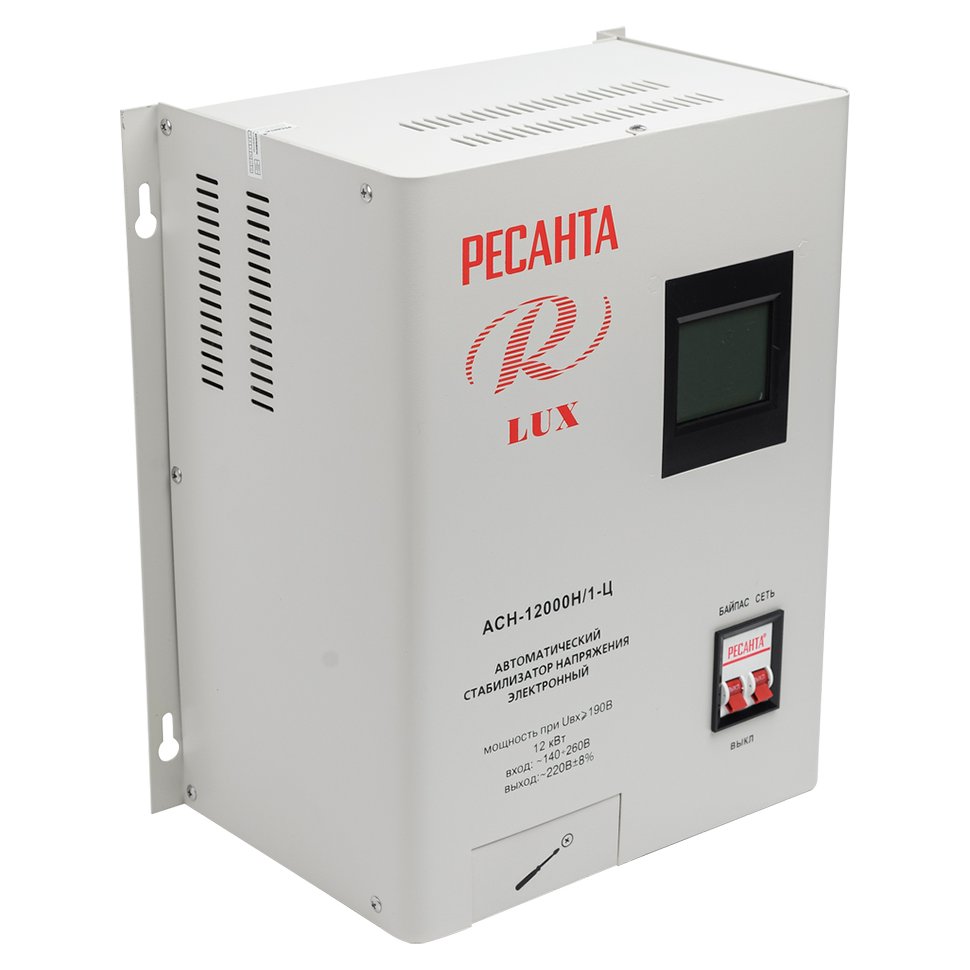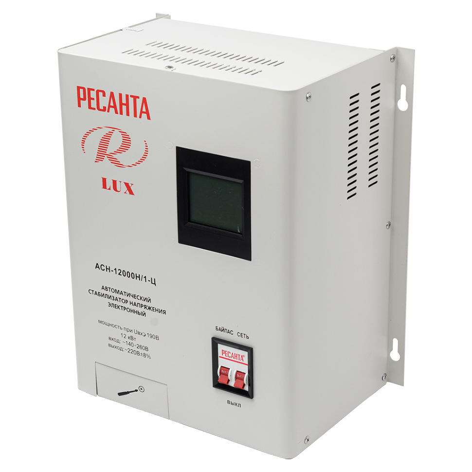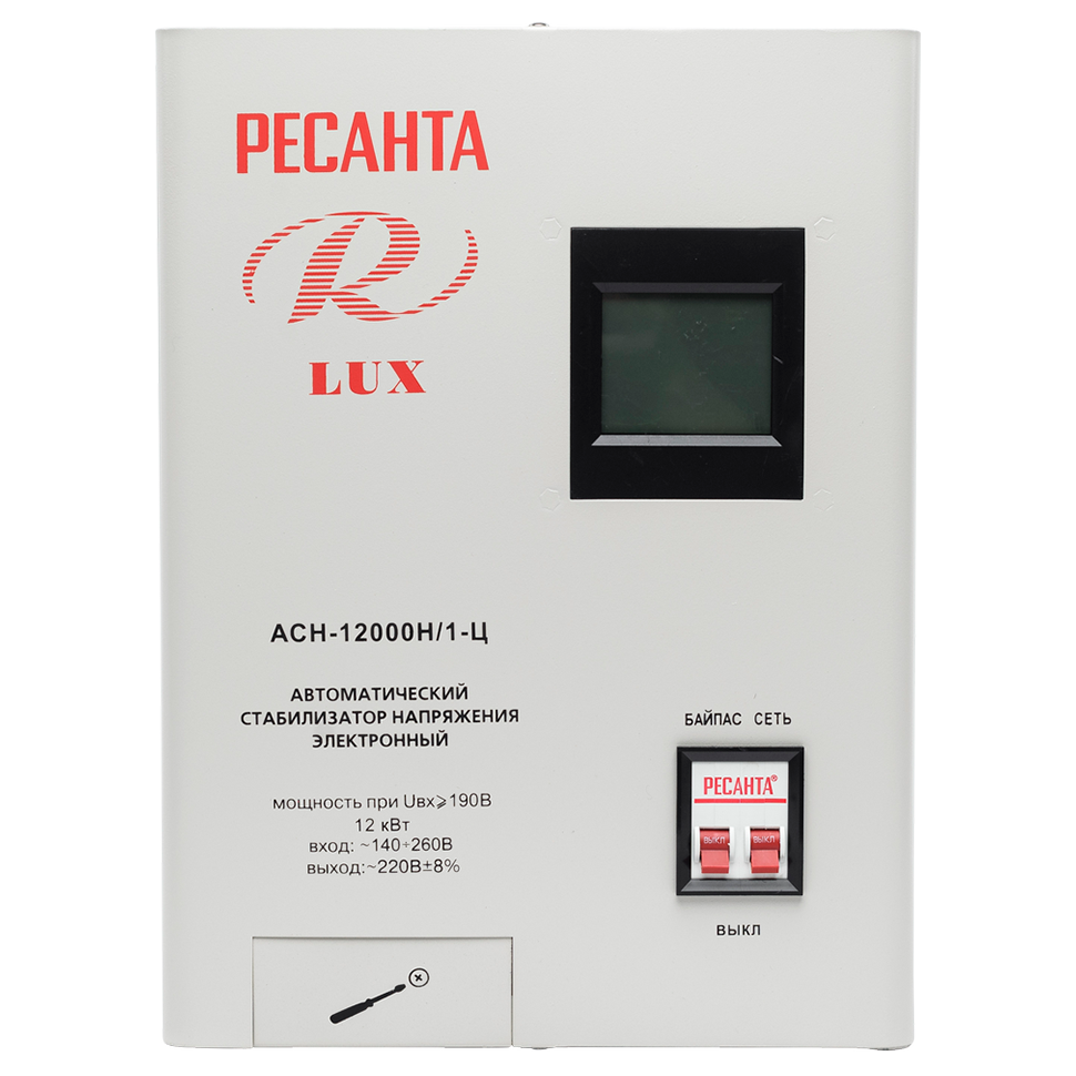 Модель Ресанта LUX АСН-12000Н /1Ц оснащена фильтрами от частотных помех, системой отключения питания вследствие превышения допустимого напряжения и имеет процессорное управление. На лицевой панели прибора расположен LCD экран, клавиши байпаса и питания. При активации функции байпас напряжение к приборам поступает в обход системы стабилизации. На экране отображаются величины входного и выходного напряжения, уровень нагрузки и другие рабочие параметры.