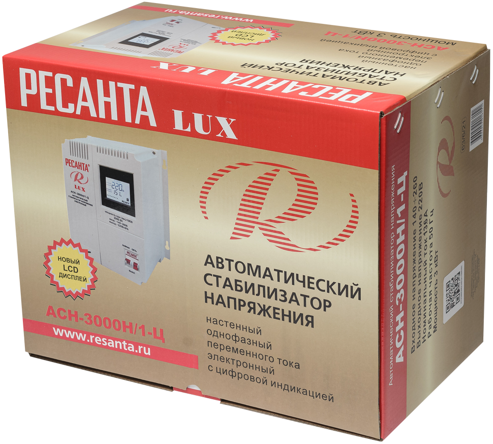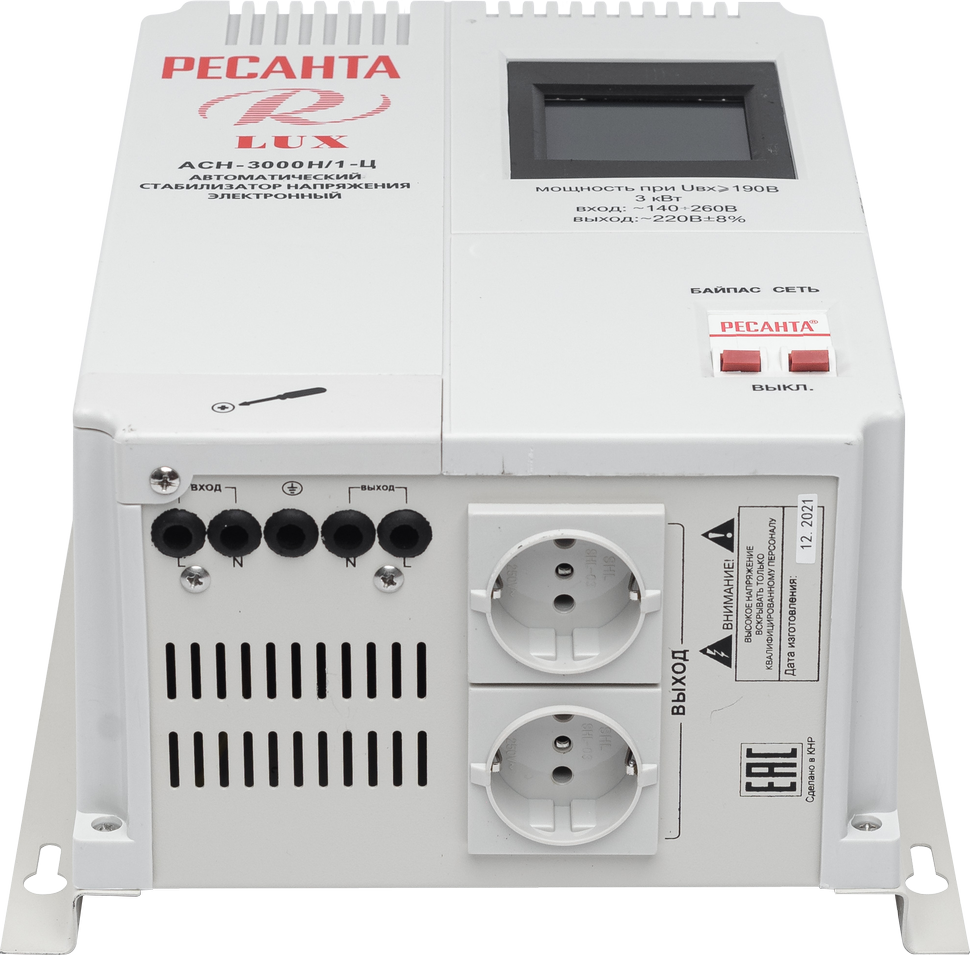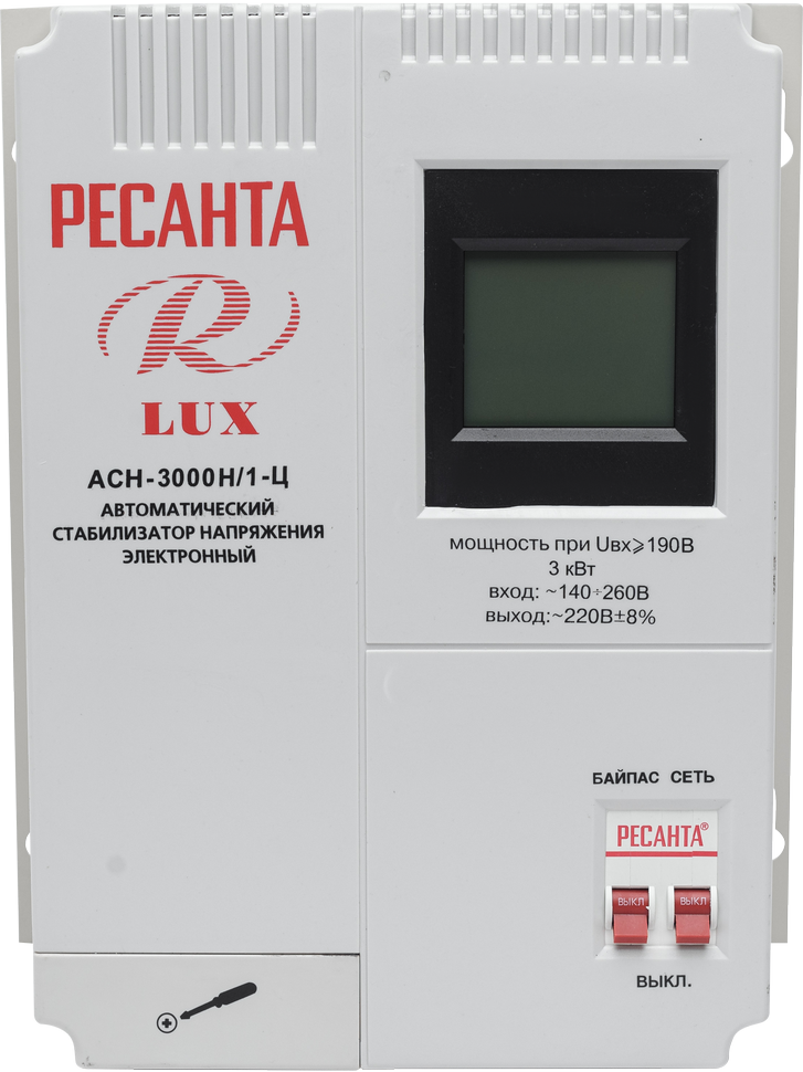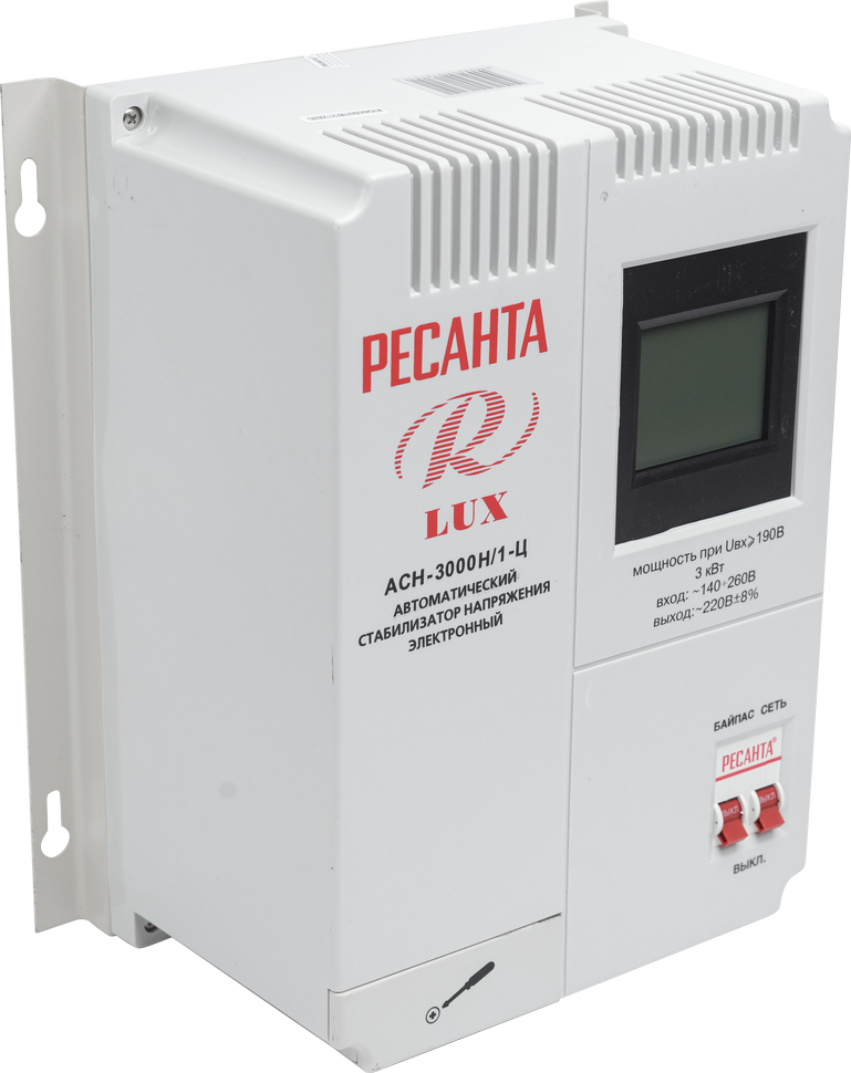 Стабилизатор напряжения Ресанта LUX АСН-3000Н/1Ц предназначен для однофазной сети. Применяется в бытовых целях. Встроенный LCD-дисплей отображают все важные параметры работы прибора: напряжение на входе и на выходе, активацию системы защиты, параметры напряжения самого устройства, а также обратный отсчет времени задержки. Индикаторы оповещают об изменениях в процессе функционирования. Прочный металлический каркас защищает внутреннюю автоматику от механических повреждений. Наличие двух розеток обеспечивает широкие возможности использования.