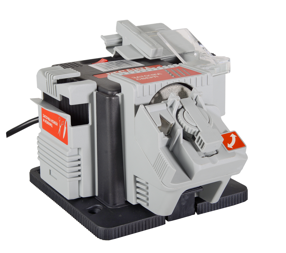 Устройство работает на базе коллекторного электродвигателя. Он является приводом для вращения заточного круга размером 49,3х7,5 мм с посадочным диаметром 10 мм. Универсальный станок можно использовать для обработки лезвий самых разных типов, ширина которых может варьироваться в пределах от 6 до 51 мм. Агрегат пригодится для затачивания сверл, диаметр их может составлять от 3 до 10 мм. Он легко выдерживает температуру от -10 до +40 градусов. Влажность воздуха в помещении и на открытом воздухе не должна превышать 80%. Устройство не рекомендуется эксплуатировать в условиях чрезмерной запыленности и под прямым воздействием атмосферных осадков. Станок отличается малыми габаритами и весит 1,77 кг. Корпус и основание выполнены из прочного пластика.