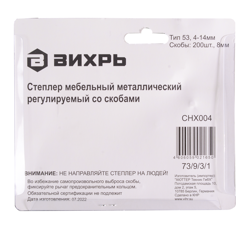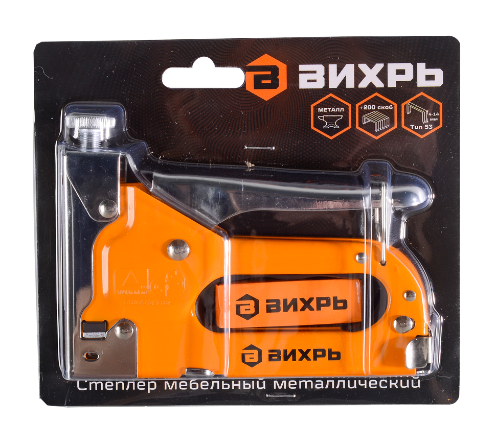 Мебельный степлер Вихрь - крепежный инструмент, предназначен для сборки и ремонта мебели, а также для других видов отделочных работ. Степлер оснащен механизмом, который позволяет легко и быстро закреплять мебельные детали, обивку, ткани и другие материалы с помощью скоб типа 53 длиной от 4 до 14 мм.