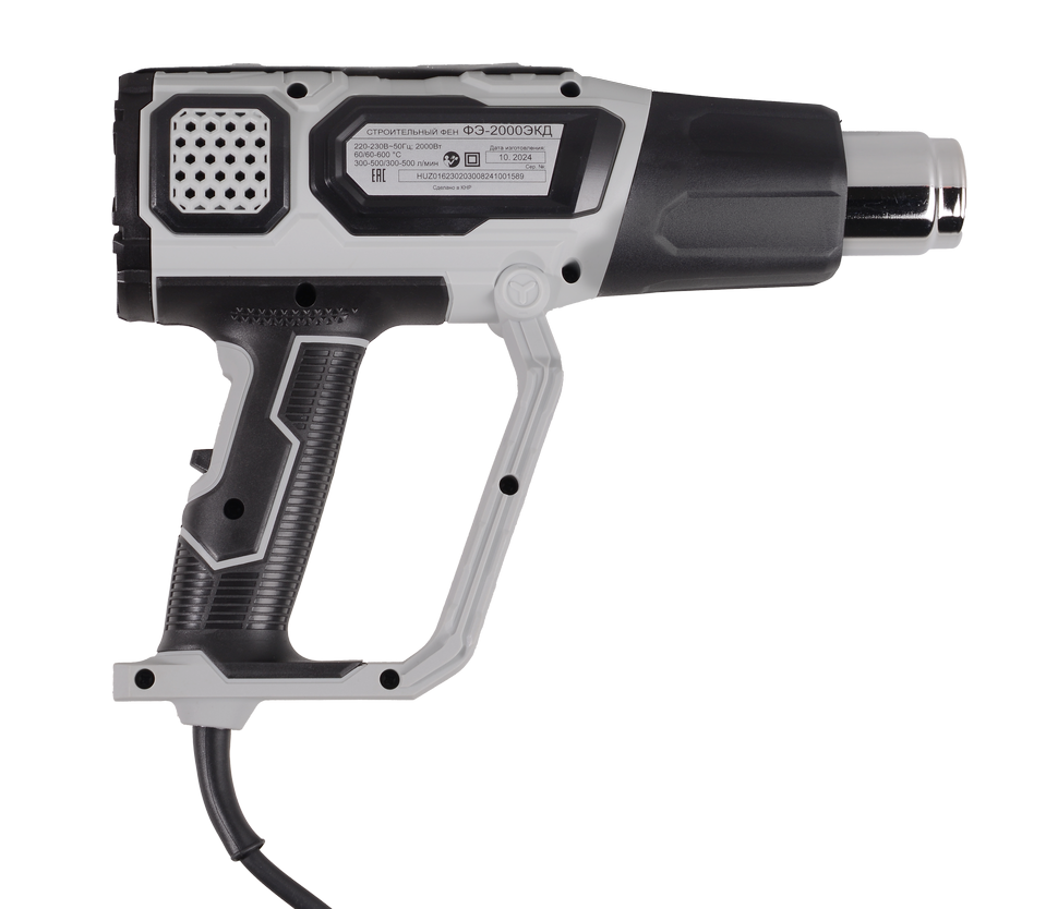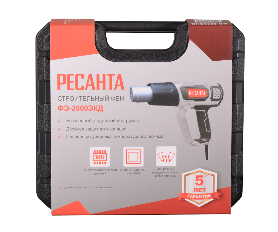 Фен промышленный РЕСАНТА ФЭ-2000ЭКД мощностью 2000 Вт используется для пайки и сварки пластмассовых изделий, формования деталей, размягчения клея, удаления лакокрасочных материалов, нагревания термоусадочных труб. Прибор работает от электросети напряжением 220-230 В. Плавная регулировка температуры имеет диапазон от 70 до 600° С. Наличие 3 режимов управления потоком воздуха от 300 до 500 л/мин позволяет настраивать интенсивность работы инструмента в зависимости от используемого материала. Электронный дисплей отображает точные параметры температуры воздушной струи. Встроенное термореле защищает строительный фен от перегрева.