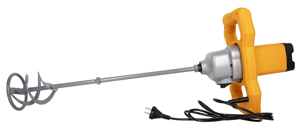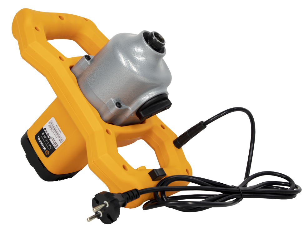 Двигатель мощностью 1100 Вт запускается посредством нажатия кнопки, расположенной на рукоятке. Электронная регулировка частоты вращения (от 150 до 650 об./мин) и возможность выбора одной из 2 возможных скоростей позволяет адаптировать устройство под любой материал в зависимости от вязкости и консистенции ингредиентов. Оснастка фиксируется в патроне М14 с резьбовым соединением и может меняться при проведении разных работ. Рукоятка переключения скоростей расположена на корпусе патрона, колесико регулятора оборотов размещено на рукоятке. В комплектацию входят 2 гаечных ключа, насадка и запасные щетки для двигателя. Строительный миксер весит 5,1 кг. Для удобства работы он оснащен двумя симметричными ручками из прочного пластика, которые позволяют надежно удерживать инструмент при произведении замеса.