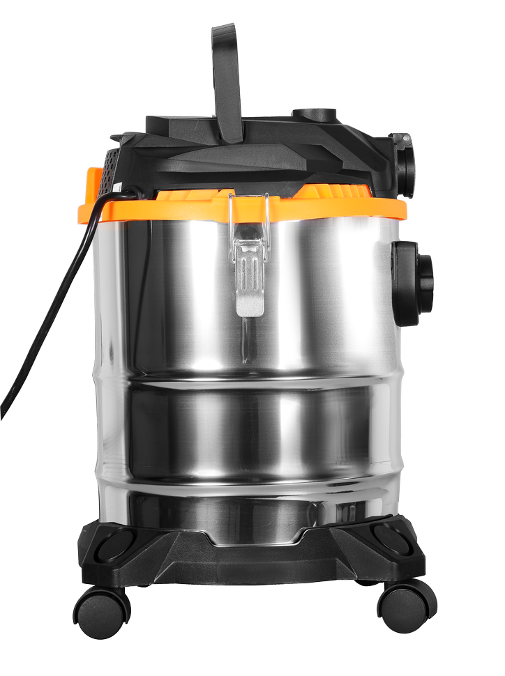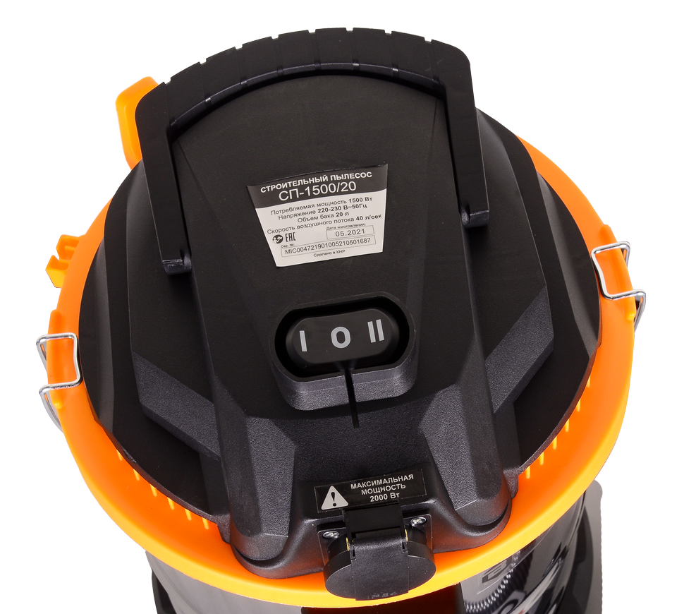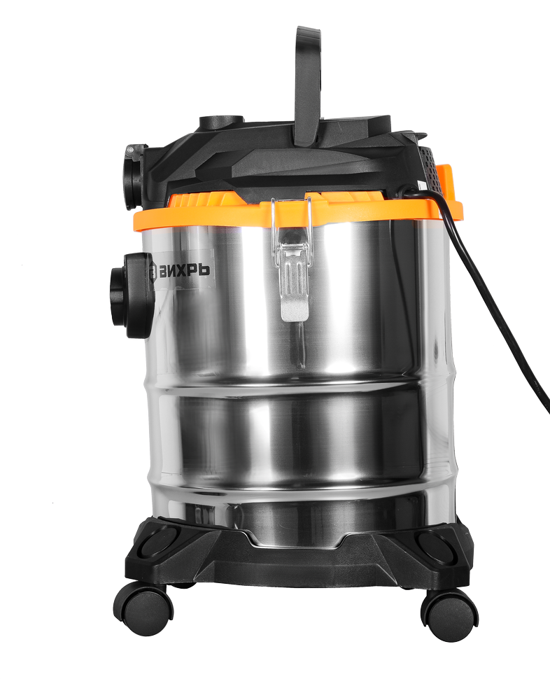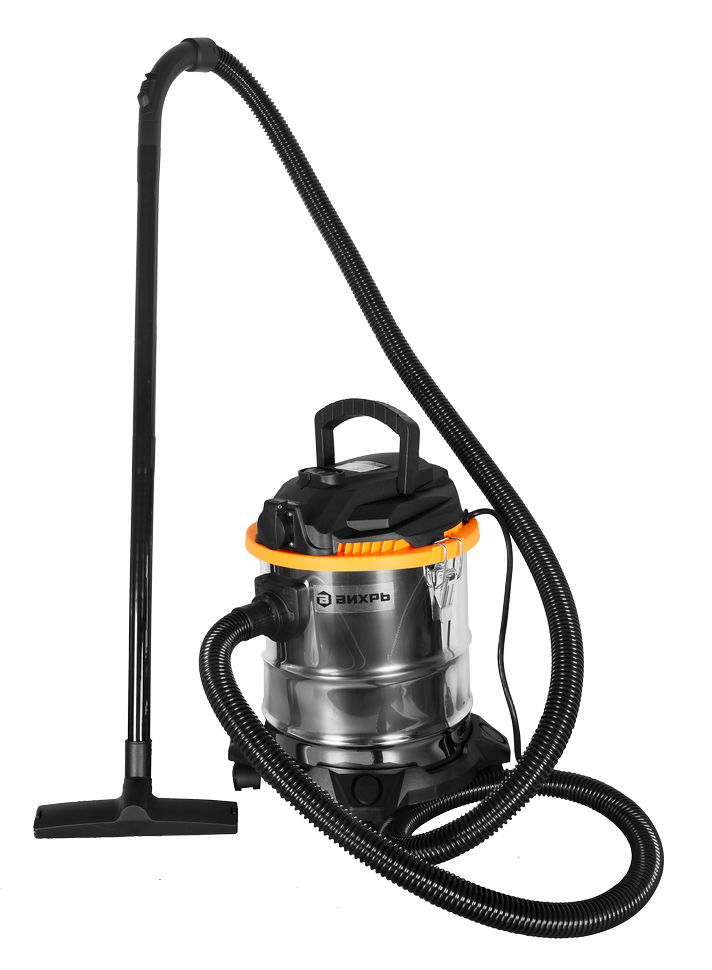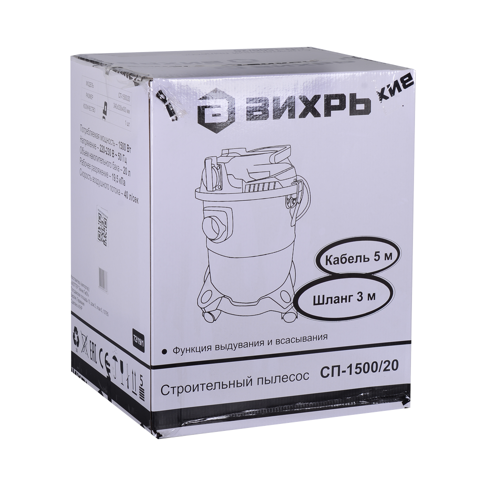 Мощность электродвигателя модели СП-1500/20 Вихрь составляет 1.5 кВт. Он обеспечивает уровень разряжения в пределах 19.5кПа при скорости потока воздуха потока 40л/сек. Строительный пылесос укомплектован гофрированным шлангом длиной 3м для стыковки агрегата к электроинструменту, сетевым кабелем – 5м и колёсами, обеспечивающими хорошую мобильность и высокий уровень устойчивости. Питание осуществляется от сети 220В, 50Гц.
