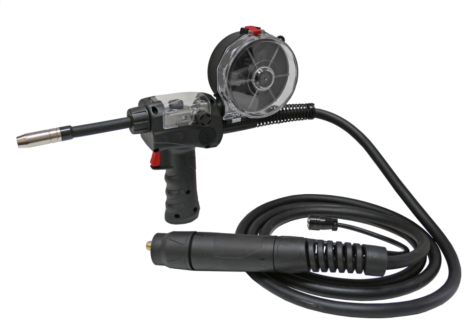 Сварочная горелка Spool Gun предназначена для автоматической подачи углеродистой, нержавеющей, алюминиевой и порошковой самозащитой проволоки при сварочных работах в среде защитных газов. Горелка имеет прочный металлический механизм подачи проволоки. Прозрачные части отсека с проволокой и механизма подачи позволяют следить за расходом. Поддерживает тип катушки D100, массой до 1 кг. Диаметр сварочной проволоки: 0.6, 0.8, 1.0 мм. Есть возможность регулировки усилия зажатия проволоки. Скорость подачи: 20-25 м/мин. Длина горелки составляет 3 м. Максимальный ток - 240 А. Расход газа составляет 10-18 л/мин.