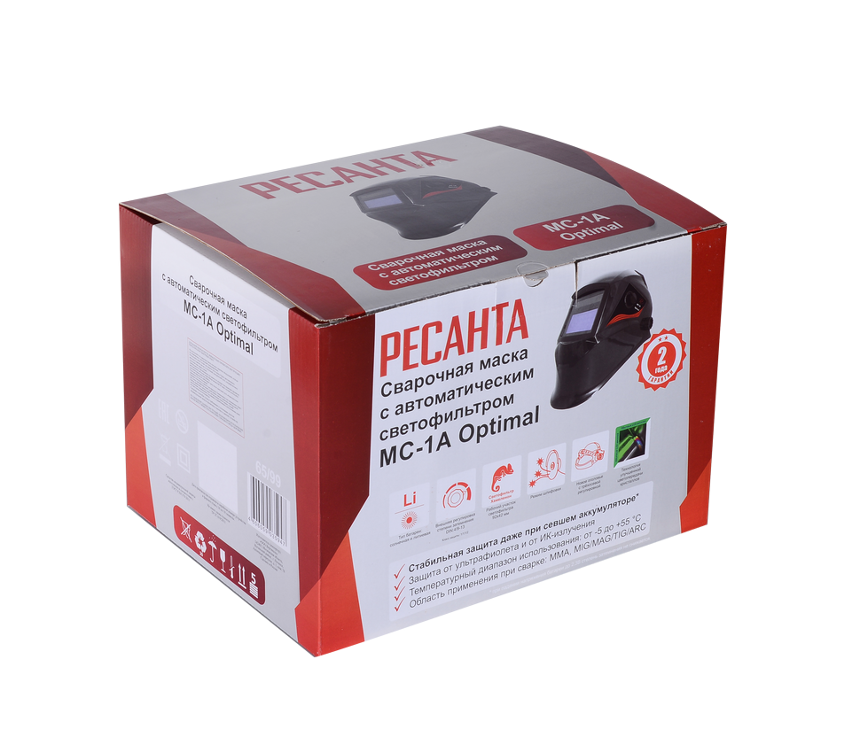 Ресанта МС-1А Optimal – это современная сварочная маска, которая относится к категории хамелеон. Автоматический светофильтр затемняется при возникновении сварочной дуги для защиты глаз сварщика от яркого света, что происходит благодаря 2 датчикам сварочной дуги и одному слою кристаллов. Затемнение в светлом режиме составляет 4 DIN, в темном от 9 до 13. При этом экран способен отлично передавать цвета в незатемненном состоянии, благодаря улучшенной цветопередаче.