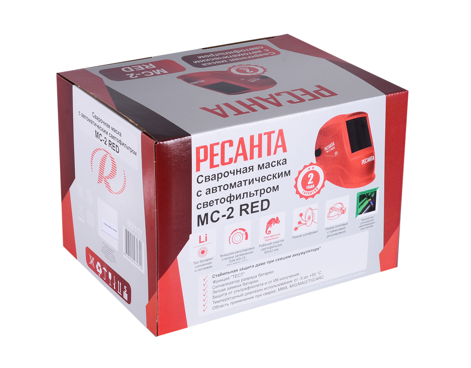 Сварочная маска Ресанта МС-2 Red является эффективным инструментом защиты глаз от ультрафиолетового и инфракрасного излучения, образующегося в процессе сварки. Кроме этого, она предохраняет лицо и шею от попадания искр. Такие маски называют «хамелеонами», поскольку они способны затемняться при появлении сварочной дуги.