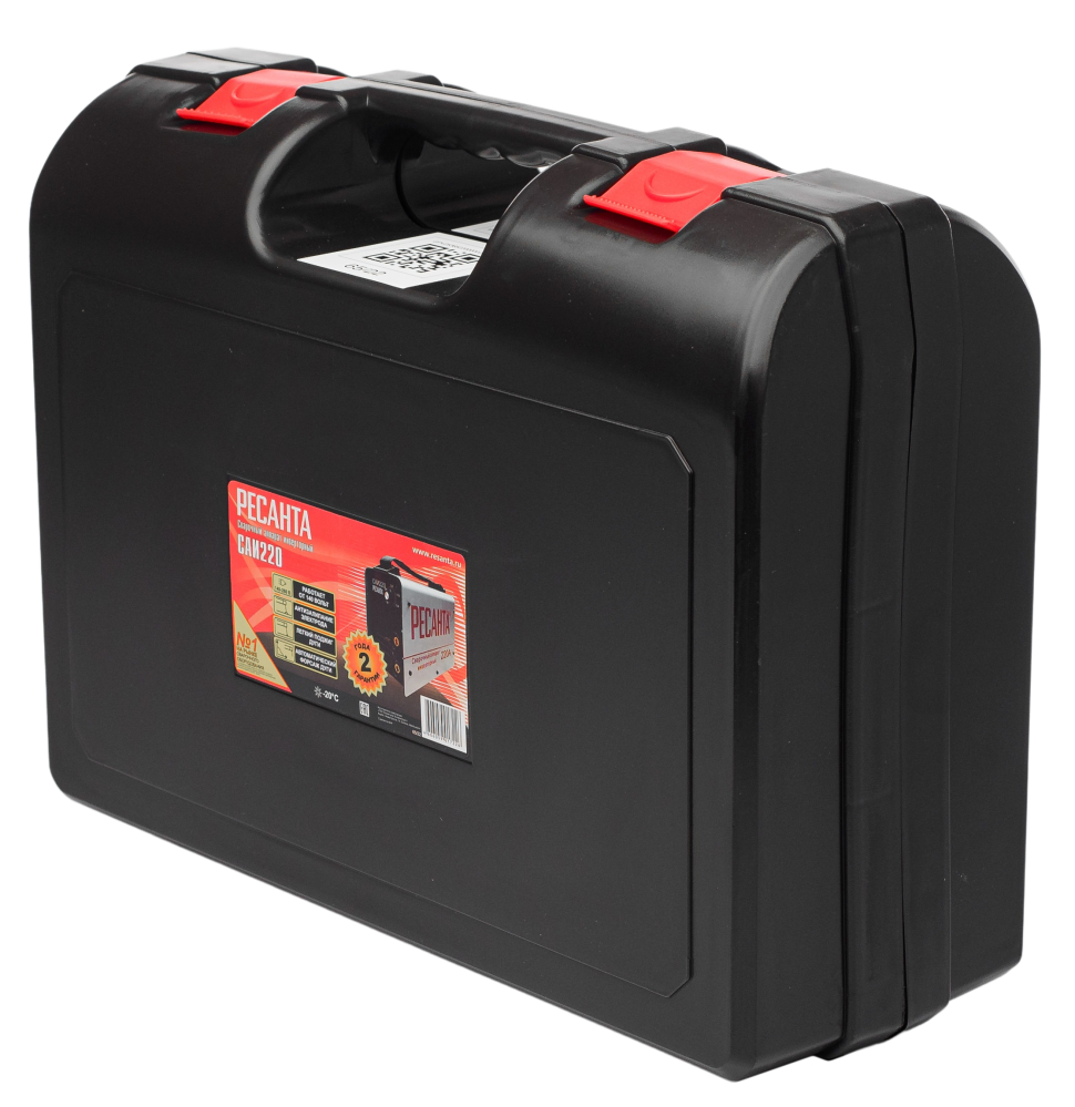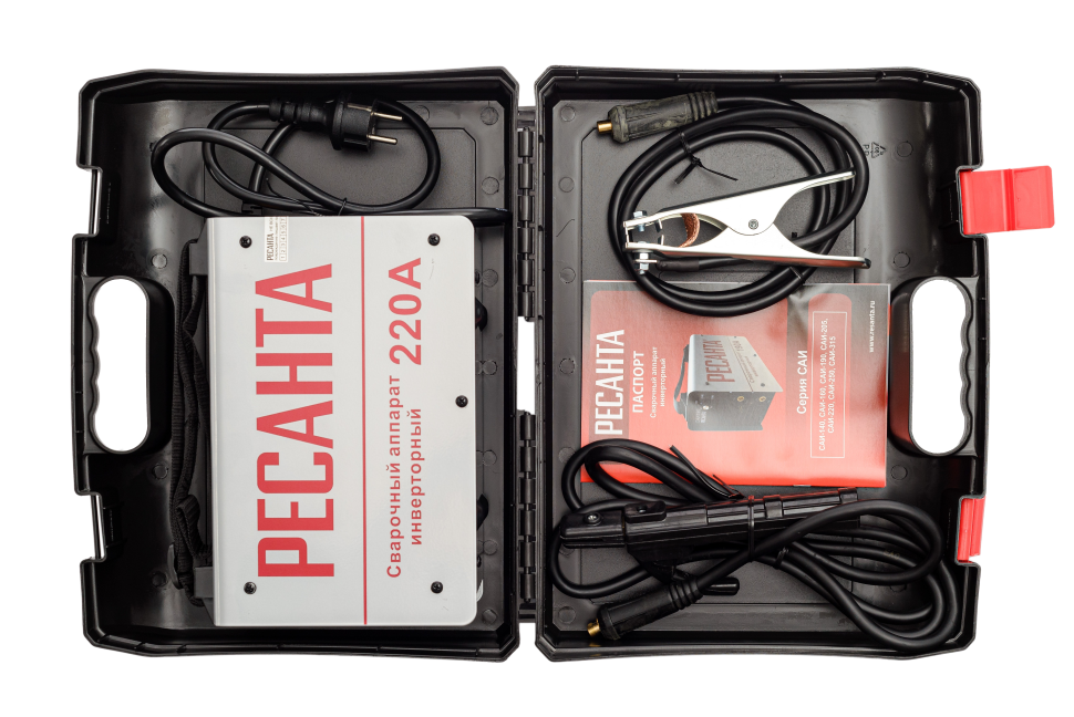 Сварочный инверторный аппарат модели Ресанта САИ 220 в кейсе подойдет для сварщиков, которые часто перемещаются между объектами. В прочный пластиковый чемодан помещаются прибор весом 4,9 кг и подключаемые кабели с электрододержателем и клеммой заземления.