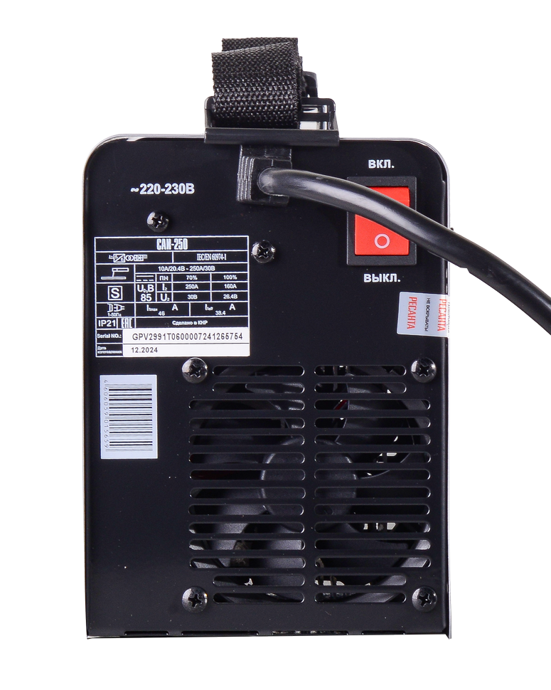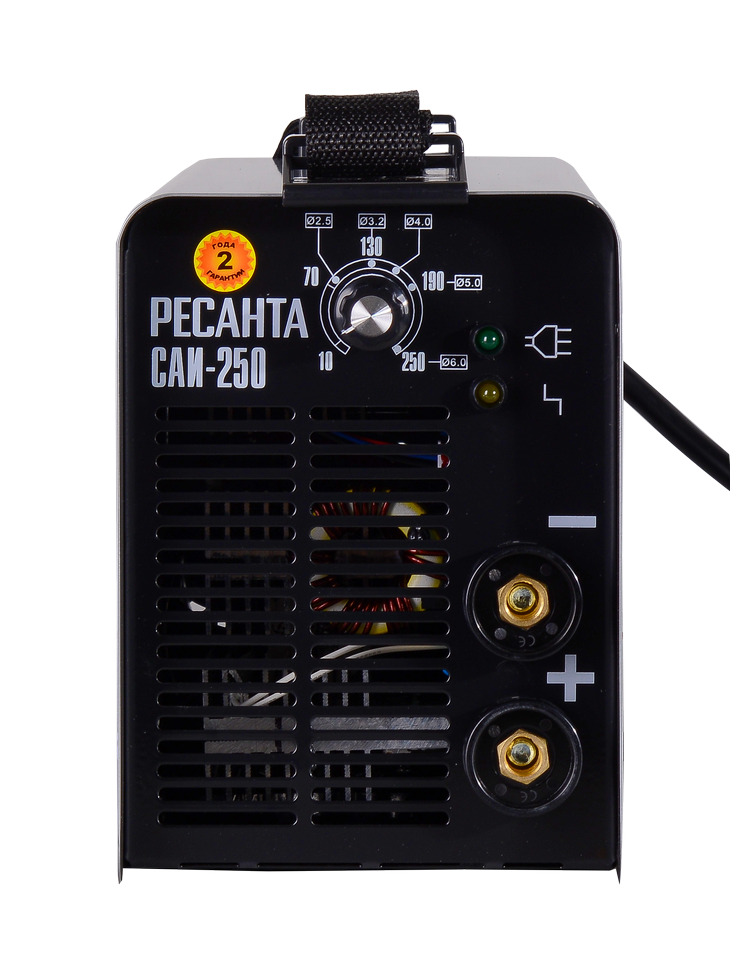 Сварочный аппарат питается от однофазной сети 140-260 В, 50 Гц. Потребляемая мощность модели Ресанта САИ-250 составляет 9,5 кВА. Сила эффективного потребляемого тока – 38.4А. Сварочный ток можно регулировать в пределах 10-250 А. Диаметр электрода – до 6мм. В сварочнике Ресанта САИ-250 реализованы функции Antistick, ARC FORCE и HOT START – уменьшение силы тока при прилипании электрода, форсаж дуги и увеличение тока на старте. Всё это в совокупности значительно облегчает сварочные работы. Агрегат может эксплуатироваться в сухом, затенённом от солнца месте при температуре окружающей среды от -20 до +50°С и влажности воздуха до 80%. Габариты сварочного аппарата 31х13.2х20 см. Вес – 4.9 кг.