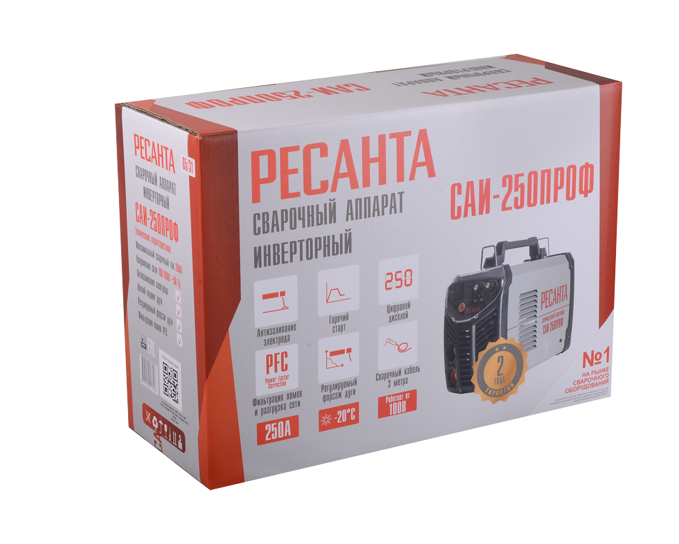 Сварочный инверторный аппарат работает в режиме ММА на электродах размером до 6 мм с рутиловым и основным покрытием, подходит для сварки металлических заготовок толщиной 15 мм и более. Регулировка сварочного тока осуществляется в диапазоне от 10 до 250 А. Модель оснащена цифровым дисплеем, который вместе с регуляторами защищен прочным прозрачным стеклом. Одним из преимуществ аппарата является наличие функции PFC. Благодаря возможности корректировать коэффициент мощности, можно сглаживать проседание сетевого напряжения и работать даже в условиях достаточно низкого входного напряжения (при 100 В). При этом для работы достаточно наличия генератора меньшей мощности, а расход электроэнергии можно сократить на 30%. Также модель оснащена всеми основными функциями, присущими всем инверторам: антизалипания, горячего старта, устойчивости дуги. Устройство комплектуется 3-метровым кабелем с электрододержателем и эргономичной складной ручкой.