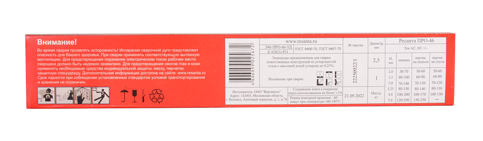 Диаметр электродов Ресанта ПРО-46 Ф2,5 составляет 2.5 мм, длина - 350 мм. Вес в пачке - 1 кг.