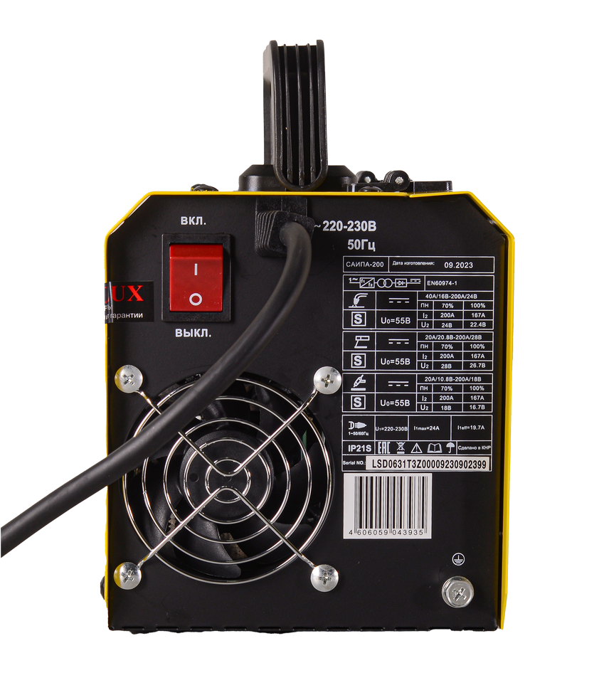 Сварочный аппарат работает от электросети 220 В при температуре от -20° до +50° С. Процесс сварки Eurolux САИПА-200 одинаково эффективен при входном напряжении в диапазоне от 140 до 270 В. Встроенный механизм подачи проволоки из катушки облегчает работу. Функция принудительного охлаждения препятствует перегреву рабочих узлов. Напряжение дуги в режиме ММА составляет 20,8-28 В, в режиме TIG – 10,8-18 В, в режиме Flux – 16-24 В. Продолжительность нагружения при нормальной температуре не менее 70%. Функция горячего старта обеспечивает быстрый розжиг. Форсаж дуги поддерживает стабильное горение электрода. Антизалипание упрощает рабочий процесс. В комплект входят кабель заземления длиной 1.2 м и сварочная горелка длиной 1.5 м.