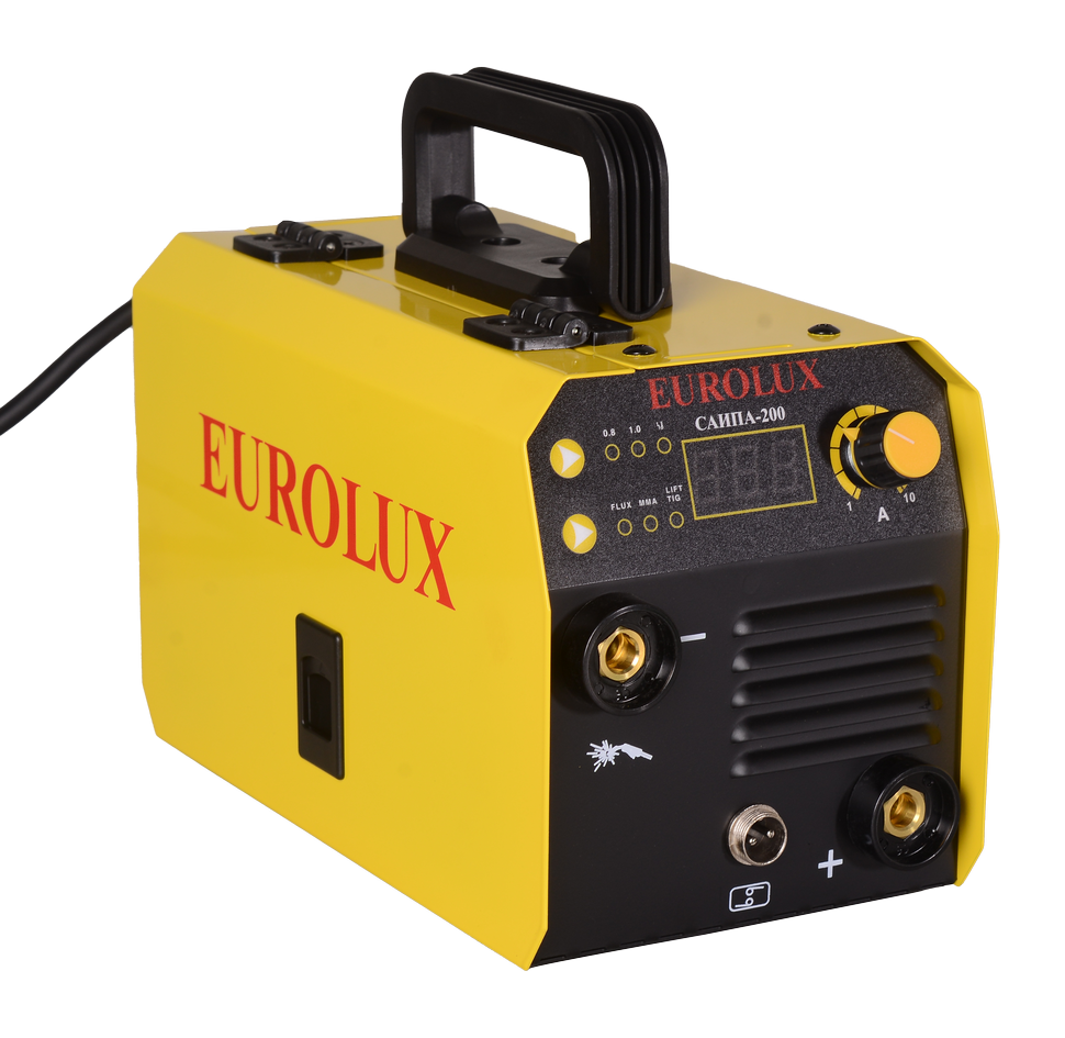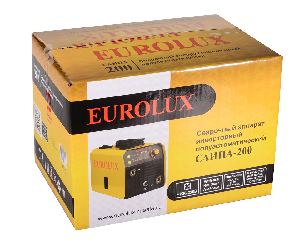 Сварочный полуавтоматический инверторный аппарат полезен в быту. Eurolux САИПА-200 выполняет швы в режиме FCAW с применением порошковой проволоки без инертных газов. При данном способе допустим сварочный ток от 40 до 200 А для разных типов металлических заготовок. Возможность использования ручной дуговой сварки штучными покрытыми электродами до 4 мм на постоянном токе, а также электродами с покрытием рутиловым концентратом, карбонатом кальция и магния значительно расширяют диапазон работ. Сварочный ток в режиме ММА составляет 20-200 А. Аргонодуговая сварка неплавящимся электродом в газовой среде TIG применяется для тонких листов от 0,5 мм, за исключением алюминия.