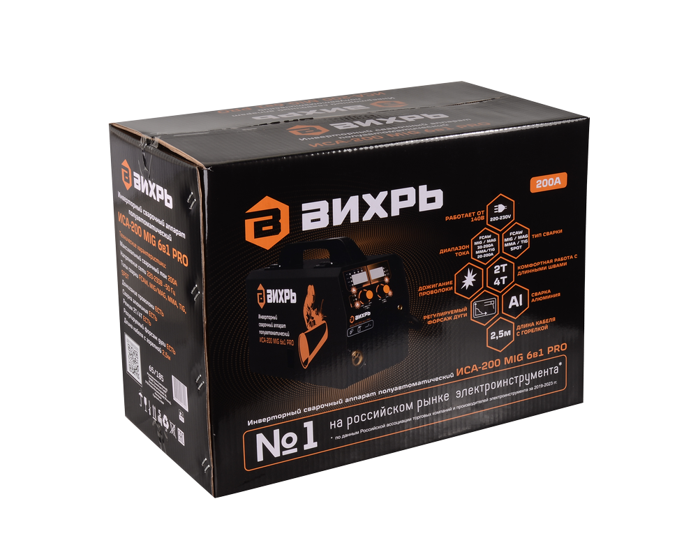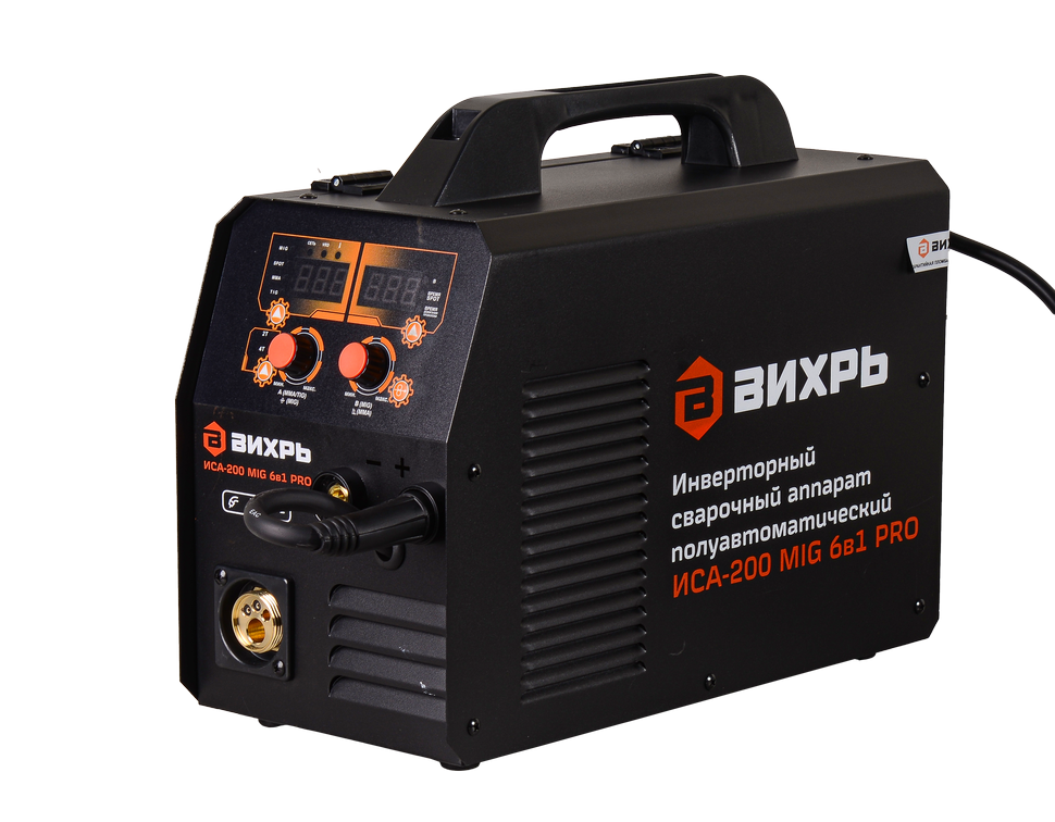 Сварочный полуавтомат марки Вихрь ИСА-200 MIG PRO способен выполнять задачи любой сложности в бытовых условиях. Широкий диапазон сварочного тока 30-200 А позволяет выполнять качественные швы в разных режимах. Сварка полуавтоматом MIG и MAG осуществляется проволокой в среде инертных или активных газов. Подходит для сталей с высоким содержанием углерода, в том числе нержавеющих. Сварка полуавтоматом FCAW производится с порошковой проволокой без газа. Для создания стыковочных соединений и размещения металла внахлест предусмотрен режим точечной сварки SPOT. Режим ММА предусматривает создание швов ручным методом с помощью дуги и покрытого электрода. В качестве дополнительного оборудования потребуется электрододержатель. Ручная дуговая сварка неплавящимся электродом в газовой среде TIG подходит для работы с металлами толщиной более 0,5 мм, за исключением алюминиевых заготовок. Дополнительно требуется вентильная горелка.