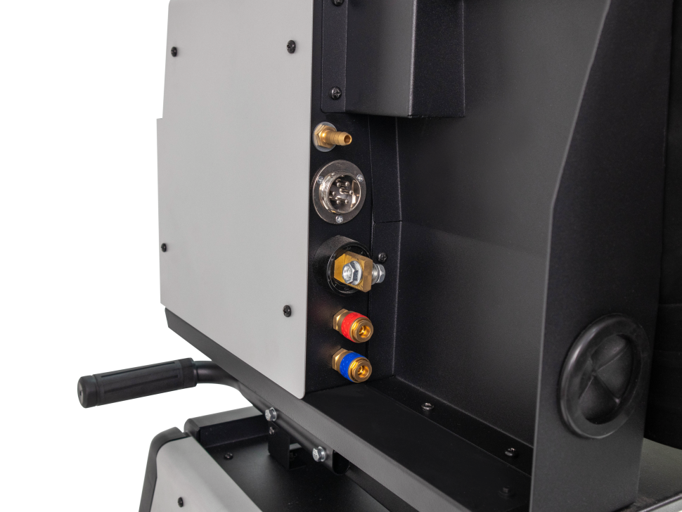 - В комплекте с аппаратом поставляется транспортировочная тележка с ящиком для инструмента, устройство подачи проволоки, газовый шланг, управляющий и силовой провод, цепь для фиксации баллона с защитным газом, сварочная горелка, кабель с клеммой заземления, кабель с электрододержателем.