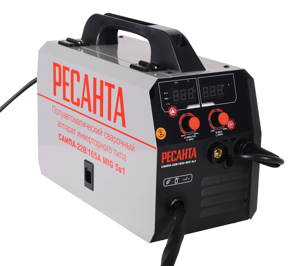 Сварочный полуавтоматический инверторный аппарат САИПА-22В/165А MIG 5в1 Ресанта максимальной мощностью 4,4 кВт (MIG/MAG) предназначен для соединения деталей из цветных и черных металлов. Технологические возможности устройства определяются диапазоном сварочных токов 20-165 А. Используется для сваривания в режиме MIG/MAG проволокой 0,6/0,8 мм в среде защитных газов и для ручной дуговой сварки плавящимся электродом 1,5-4 мм в режиме ММА. Возможна сварка порошковой проволокой без использования газа.